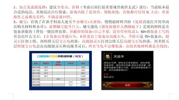 开局背包里一把剑装备上,然后去杀魔蛛,升级属性全加攻击,为了刷怪的效率。刷出来的装备属性优先。刷满一身装备后去打肥虫。肥虫和魔蛛是任务怪,可以重复做。能打肥虫后去找地主婆婆,任务奖励100万,也可以重复做。做两轮攒够钱买个密保,密保先选金密保(金附加攻击,木是生命,水是闪避,火是命中,土是防御)。密保升阶跟强化这个也很重要,前期已升阶为主。密保先升五级,然后强化满再升级。(五级后的强化石是高级强化