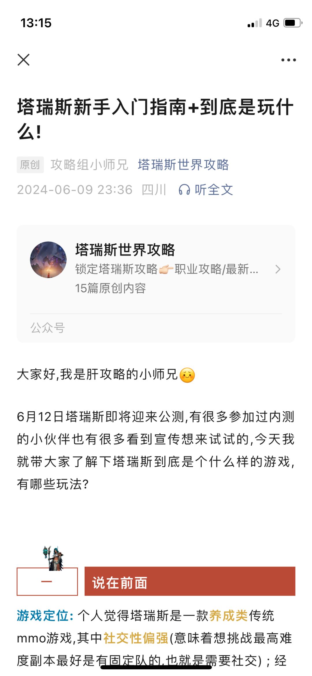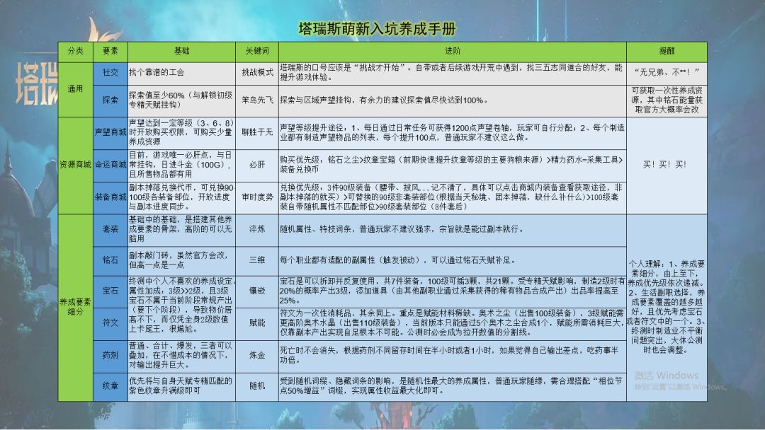 塔瑞斯世界第6天必做安排: 解锁新主线升级,到达未解锁主线即可,一定要把技能和铭石装好,开启第最后一章副本(秘境第一层):等级还不到开放副本的话,优先做日常任务,把任务栏的任务全部解决掉,声望刷新一定要做完!!战场打两把(不可挂机)这些做完肯定40级了,恭喜你刚刚踏出新手村的等级。 黑暗入侵今天更新,建议早点去,组队打因为是共享次数的,会很快完成。可以得到大量铭石能量的。 然后周末肝了得兄弟,目前