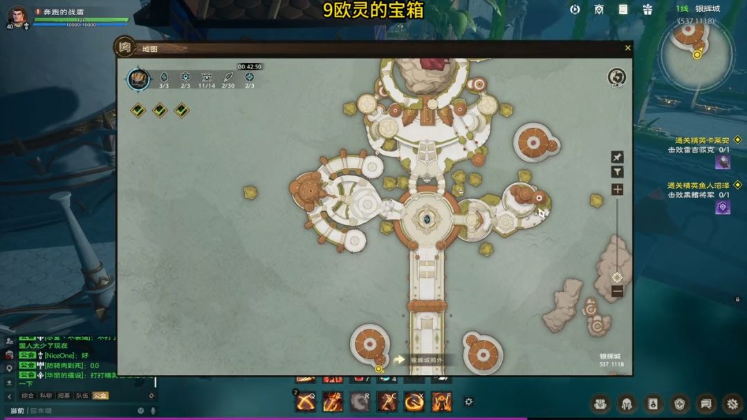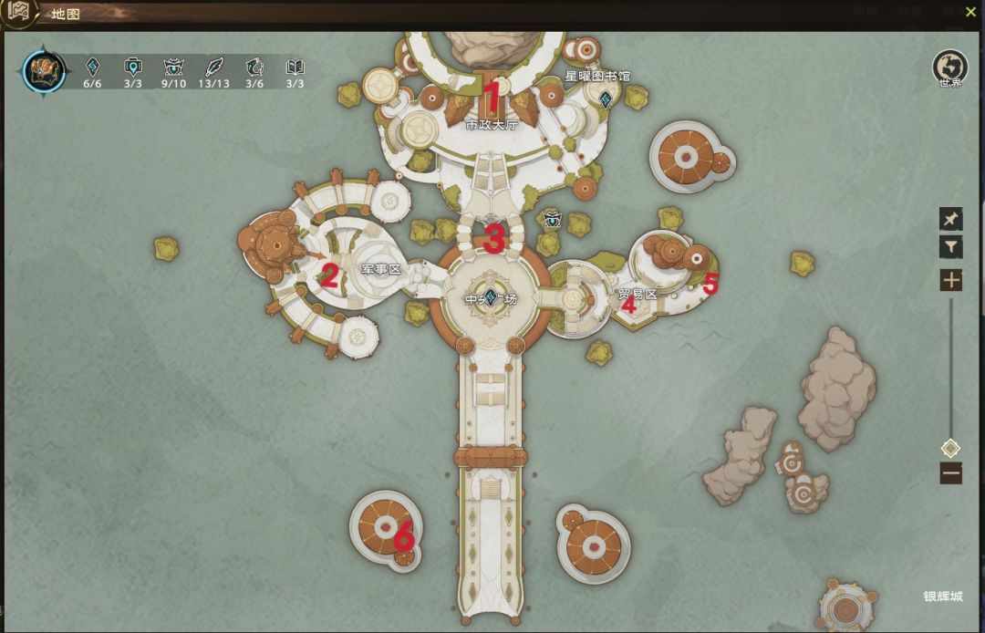 银辉城主城一共10个宝箱 1:进门左手书架上钥匙 2:雕像手中钥匙(需要技巧才能跳过去,建议新手跳过) 3:许愿池钥匙(多摸几次,直到摸到钥匙) 4:打小蜥蜴后给任务道具,点击道具触发任务给钥匙 5:草里钥匙 6:空岛钥匙,需要飞行 7:图书馆副本面对第一个boss左手书架上有钥匙,会有闪光,很容易找到。 8:任务链钥匙:1蜂蜜>2糖果>3布娃娃>4藏宝图>5钥匙 9:安卡什峡谷地图有一把银辉城钥