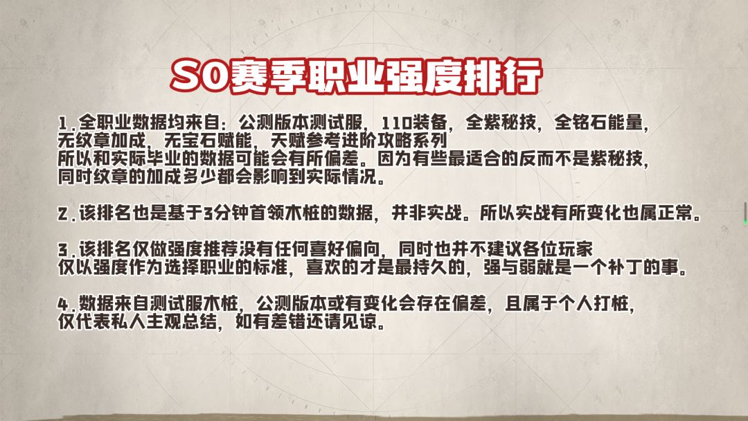 公测会去“无尽之怒”这个服务器,大家愿意的可以一起来玩! 这个排名有一下几个原则#塔瑞斯世界 #塔瑞斯世界开荒征集 1. 为110装备 全紫秘技 全铭石能量,无纹章下的加成,所以实际毕业的数据可能会有所偏差,因为有些最适合的反而不是紫秘技,同时纹章的加成多少都会影响到实际情况。 2. 该排名也是基于3分钟首领木桩的数据,并非实战。所以实战有所变化也属正常。 3. 该排名仅做强度推荐,没有任何喜好