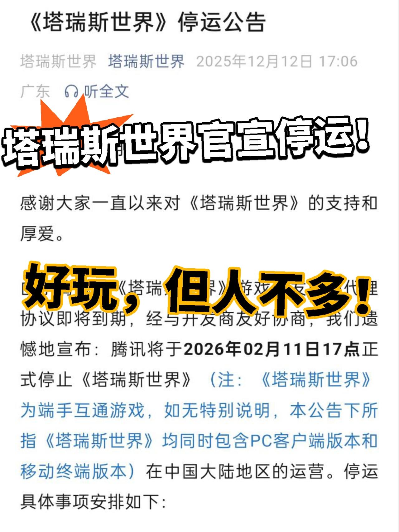 昨天腾讯突然发公告,说《塔瑞斯世界》国服要停运了。 官方给出的理由是跟开发商的代理协议到期,所以决定在2026年2月11号关服。 算算时间,这游戏从2024年6月上线到现在,也就一年半多一点。 看了下具体安排,从昨天下午五点开始,就不能再注册新号和充钱了。 等明年2月25号,官方的社群和客服也都要解散。 服务器一关,玩家辛辛苦苦练的号、攒的数据,直接就没了,说是会永久删除。不过官方也给了