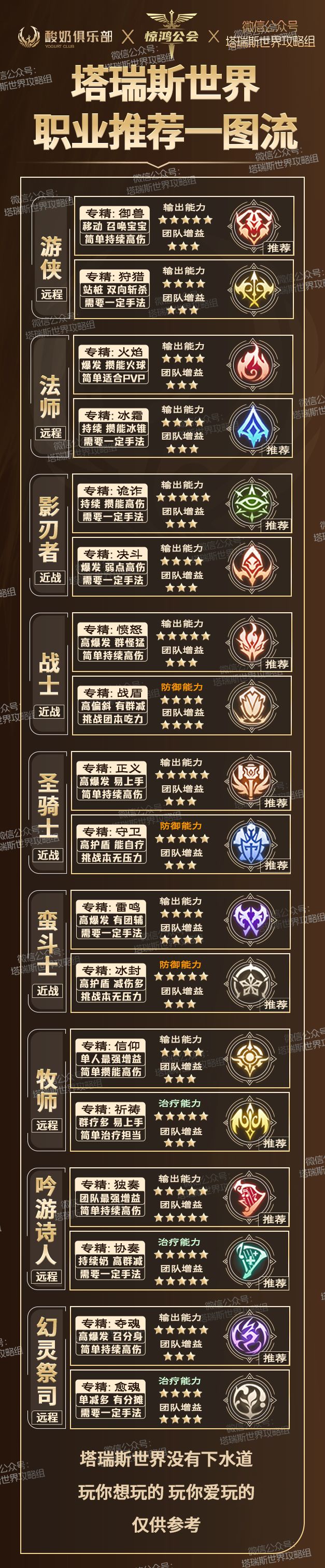 塔瑞斯职业选择 首先强弱问题 官方态度是谁强削谁 谁弱加谁 力争平衡 一个补丁的事儿 塔瑞斯职业都是 12技能攒能量 3技能把攒的能力打出去—泄能量 4群伤 5小大招 6大招 只是技能的样子名称不一样 效果和体验都差不多 所以只需要先确定 治疗、坦克还是输出! 远程还是近战 小的职业特色 谁说都不管用 说你也不信 要不你也不可能看那么多视频 进游戏再试一下 前5分钟就是让你体验的 前面一进去终极B