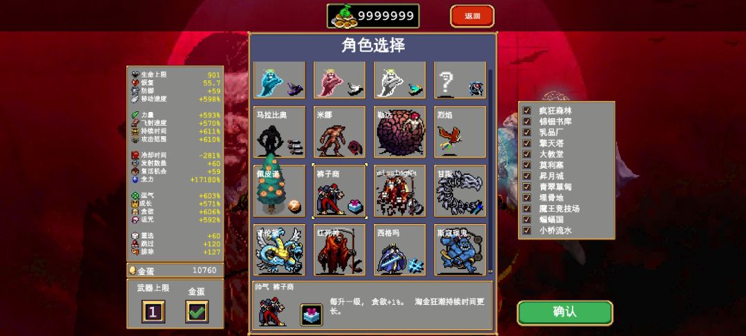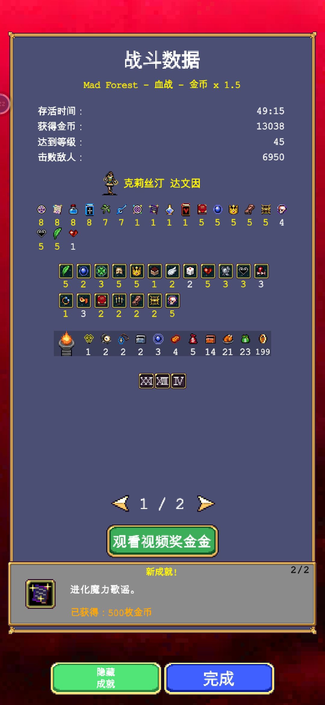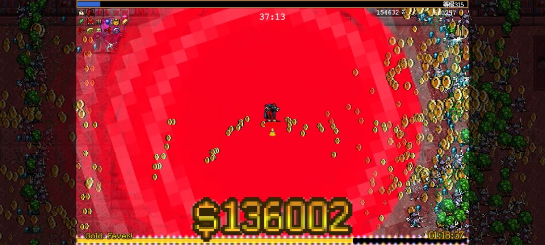 单武双卡开局,武器大蒜(高蛋最流畅的武器),双卡是黄金迪斯科和邪恶季节,辅助主要是前四个,5分钟捡到超武,选恶魔眼,然后原地挂机。其实千蛋就行得到需要选个时空卡,要不还得跑图