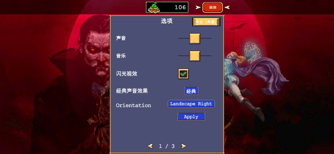 教大家横屏和选择语言,点开选项经典声音效果下面第一个英文按钮点一下可以选择横屏左右,下面第二个英文按钮是用来设置横屏的点一下就会根据你选的横屏左右横屏,中文在选项里右上角黄色按钮设置。