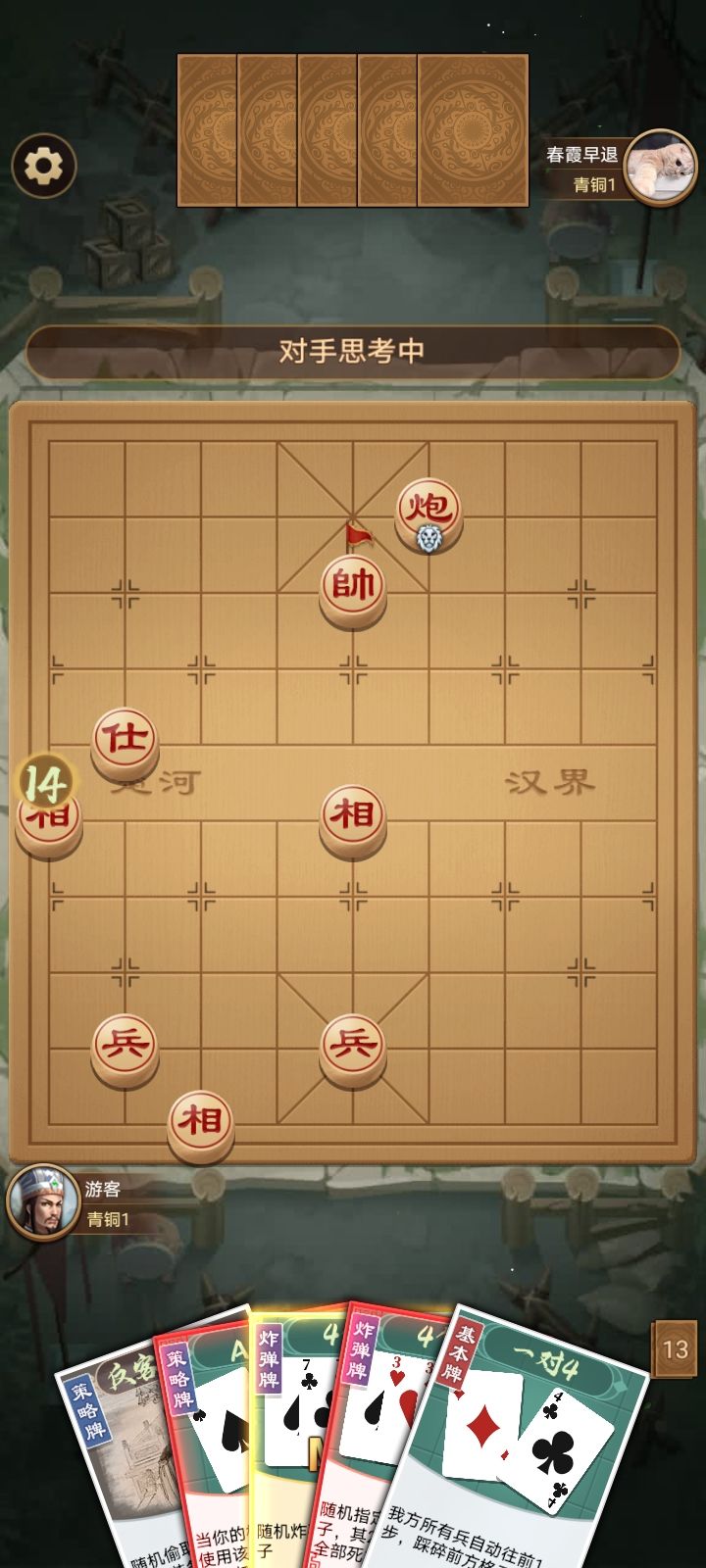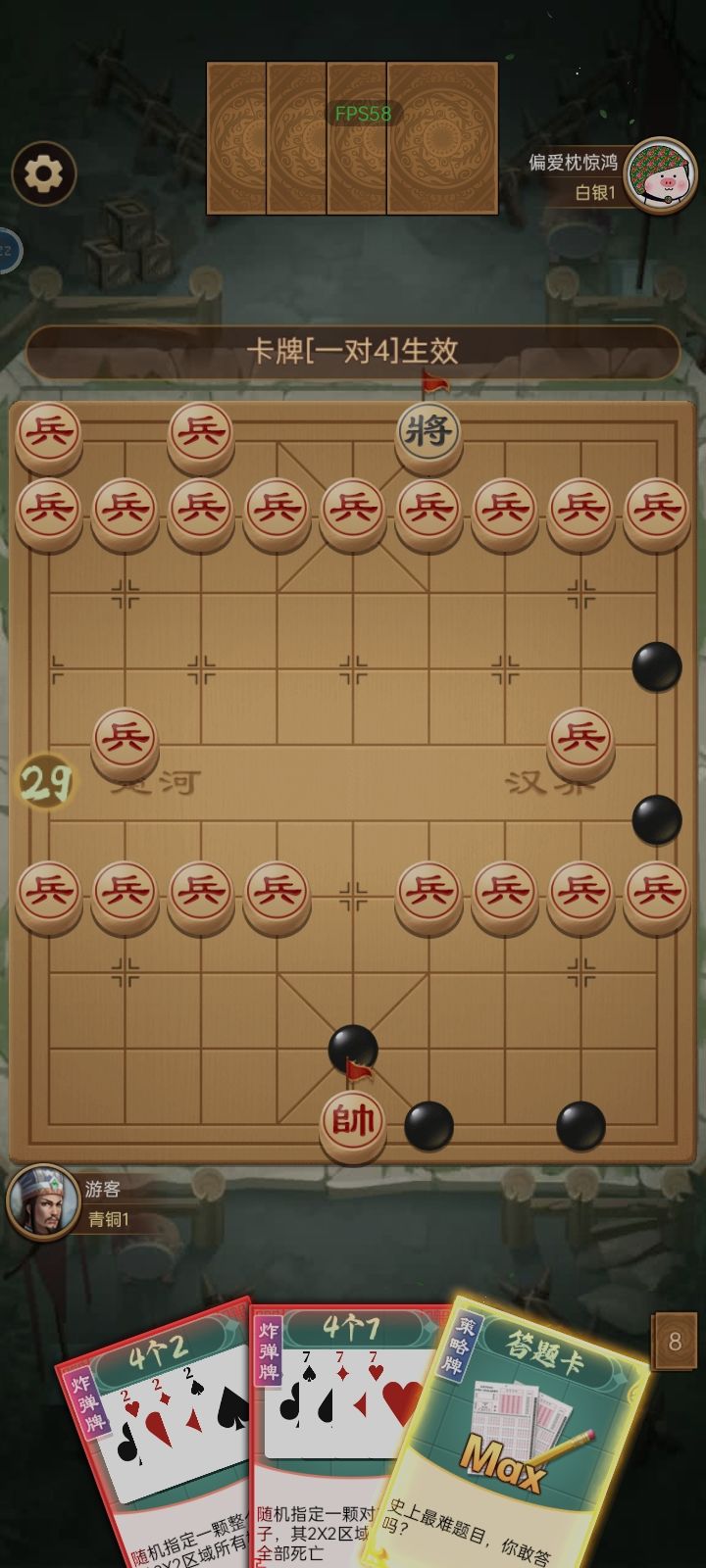 对面除了将没有别的棋子之后使用“答题卡max”,会导致游戏卡死,见录像。不知道有没有“答题卡”有的话不知道会不会产生相同bug?请一并排查,谢谢