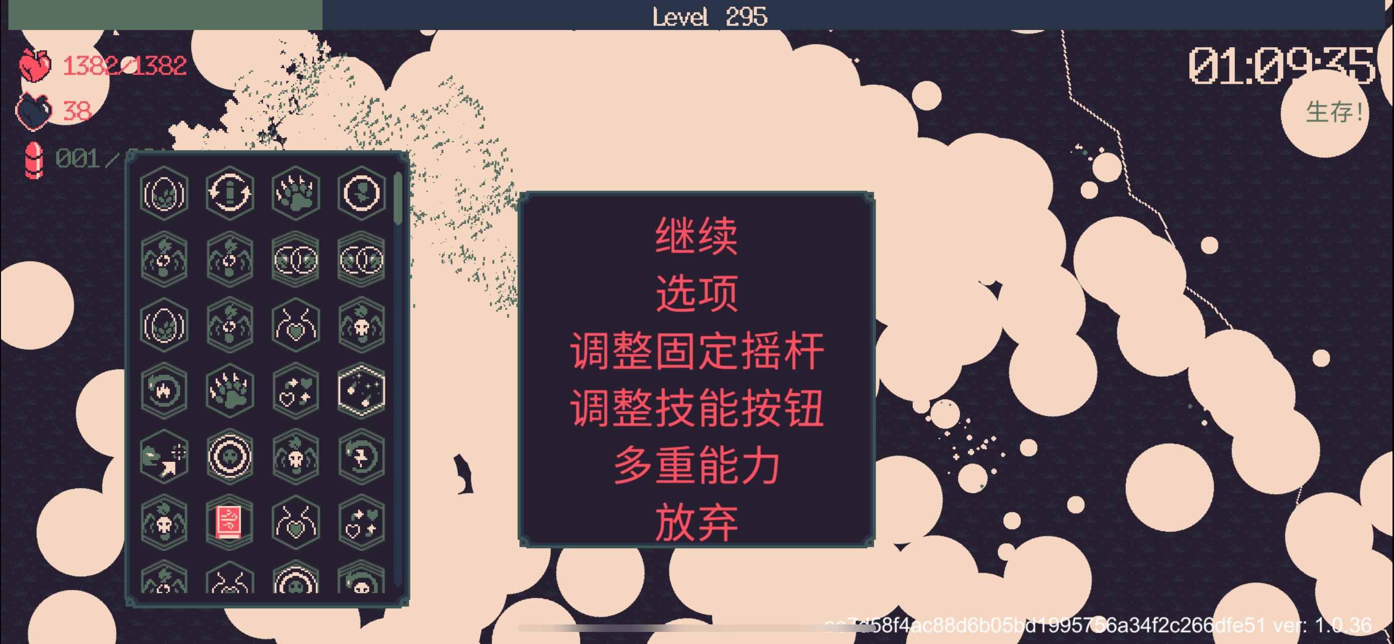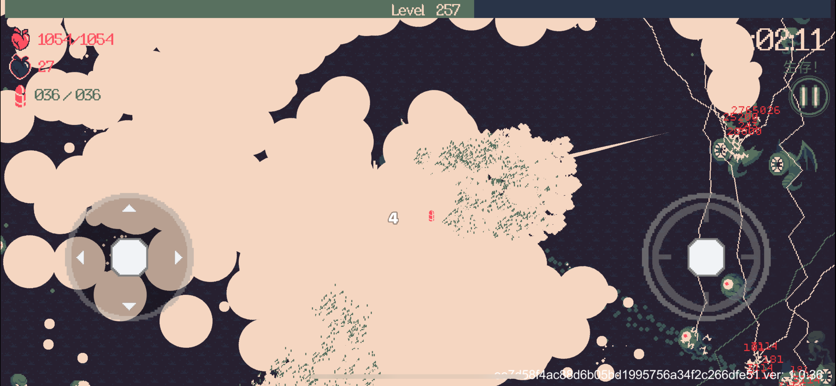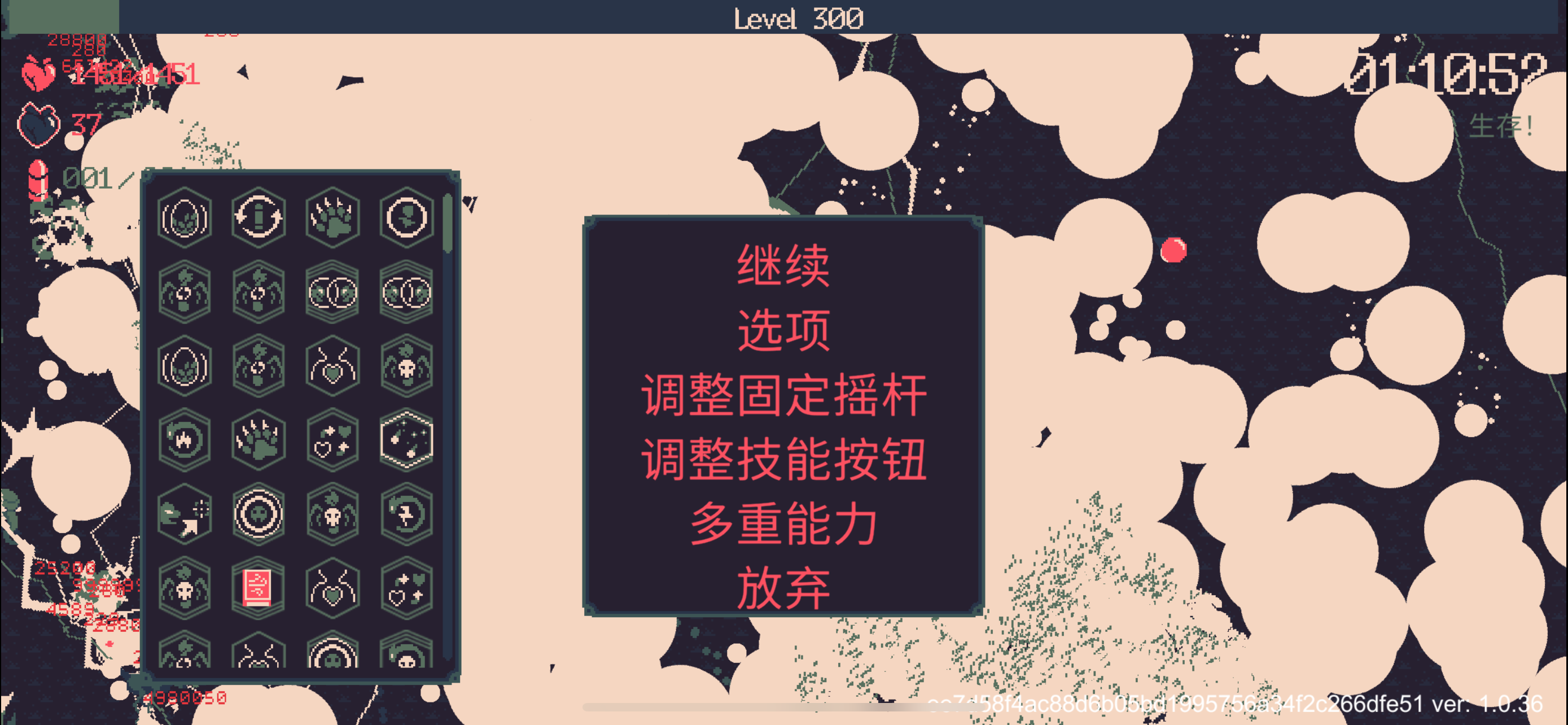我把怒眸点满后基本就不需要开枪了,自杀前是一次怒眸的全屏伤害七八万起。(范围已经大到覆盖屏幕外了)玩了一个钟,无论什么怪,一出现就被秒了,至于为什么要点守护,因为我后面老是去撞那个毒圈。血量其实有极限的,满了后就不再增加,不然我应该是有起码三四十颗心。后面越来越卡,我其实中途都睡着好几次了()