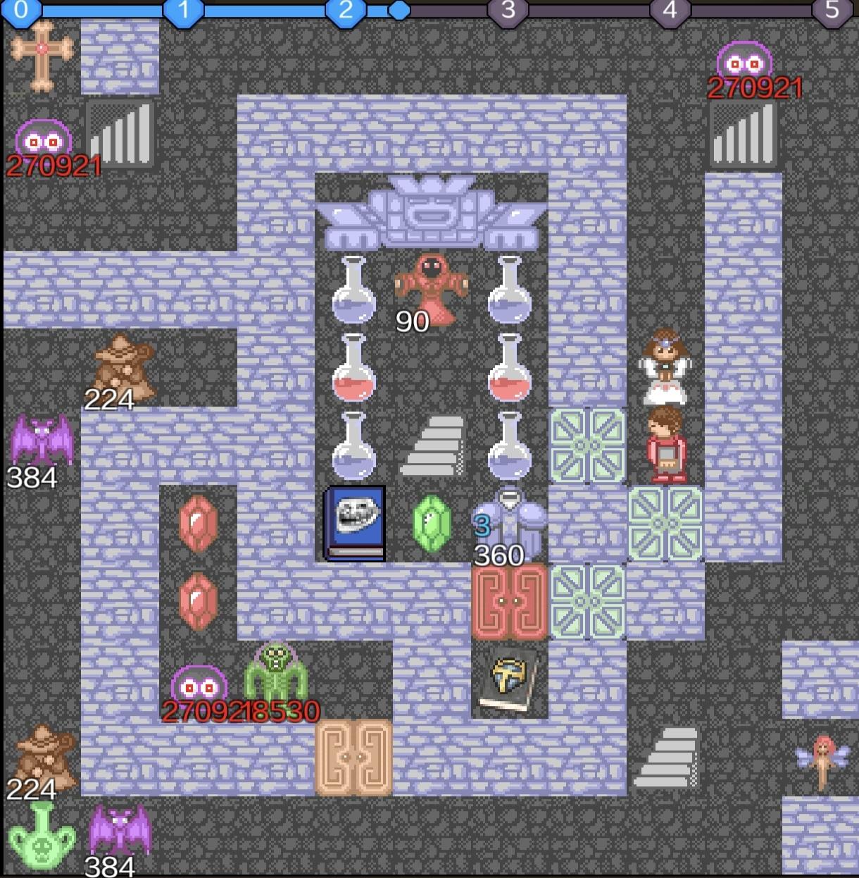 玩了一会儿新新魔塔2,有点找回了小学时和朋友守着电脑玩魔塔的感觉,感觉这是三原塔之外为数不多的挺好玩的魔塔了,功能齐全,剧情丰富,但也有一些缺点。本游戏有如下区域:主塔25层,魔塔25层,侧塔10层,密室7个,塔外皇宫,白银之穴。我只为体验魔塔剧情而不想挑战自己,所以我玩的无敌版(开局100攻防9W血)。故事续前作新新魔塔的好结局(带回了真公主),谁知旧魔塔死灰复燃,国王为了活命就把公主给送回