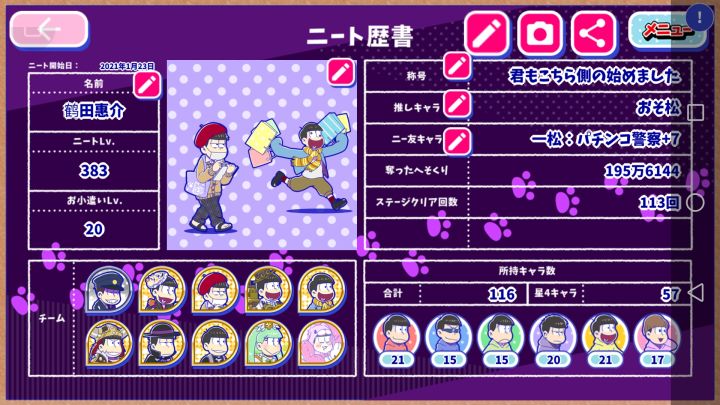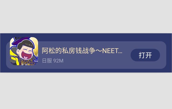 阿松的私房钱战争〜 NEET的攻防〜,名字是真的长。日文全称是:元祖! おそ松さんのへそくりウォーズ~ニートの攻防~,是不是很长。16年3月上线的日服游戏,日文日配,其实日文不是障碍,日服手游其实都大同小异,操作内容也基本一致,门槛很低,全靠猜都猜得准,实在不行也可以用各种截屏翻译工具(比如有道翻译官)。=下载办法=IOS:目前只有在日区苹果商店可以下载,搜索“元祖! おそ松さんのへそくり