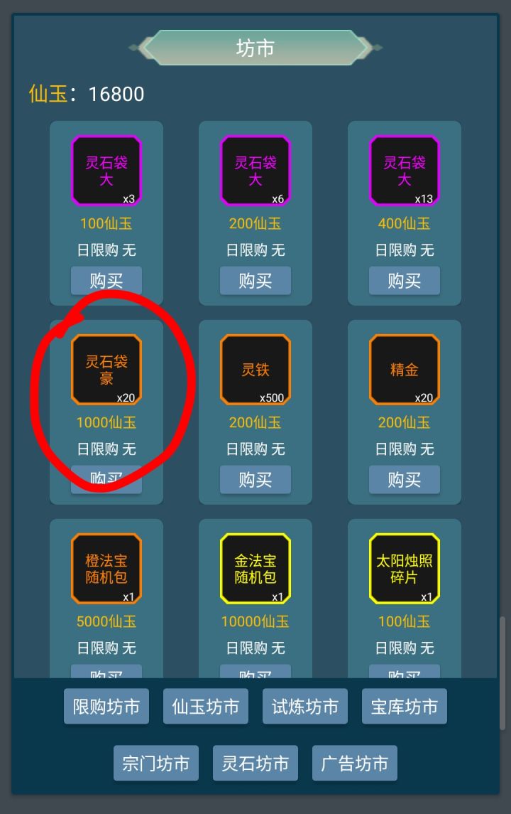 1,开局把所有礼包码领了,别人有写,我这在写一次,XXSD666 XXSD888 XXSD999 XXSD200 XXSDBC1 XXSDBC2然后把当天广告看了,每天五次灵石广告共计50万,五次仙玉广告共计2500仙玉,每个广告还有10广告积分,然后去广告坊市积分买仙玉袋,2,所有仙玉买仙玉坊市的,橙色灵石袋性价比最高(附图一),然后所有灵石升级卡包,卡包等级影响各品质的概率,还有就是每张卡的