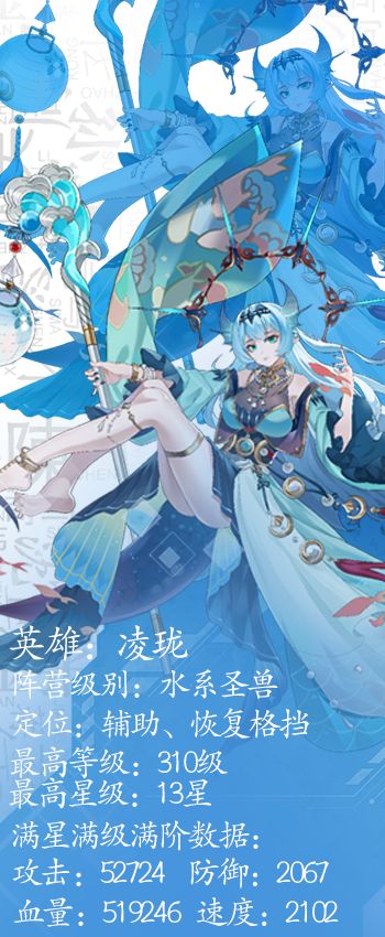 我的歌声究竟存在什么魔力呢?为什么世界都在疯癫 -凌珑 【凌珑】 昵称:美人鱼 人设:魅音鲛珠 定位:恢复格挡 职业:辅助 阵营:水系 级别:圣兽 【人物传记】 他们到底是因为我的歌声还是我声音中的魔力才剧集在我眼前的呢?望着自己面前听得如此如醉的人群,凌珑唱着歌,思维却突然被从对唱歌的专注中抽离出来。 身为鲛人一族,这种能够感染甚至控制别人的歌声是他们与身俱来的能力。玲珑