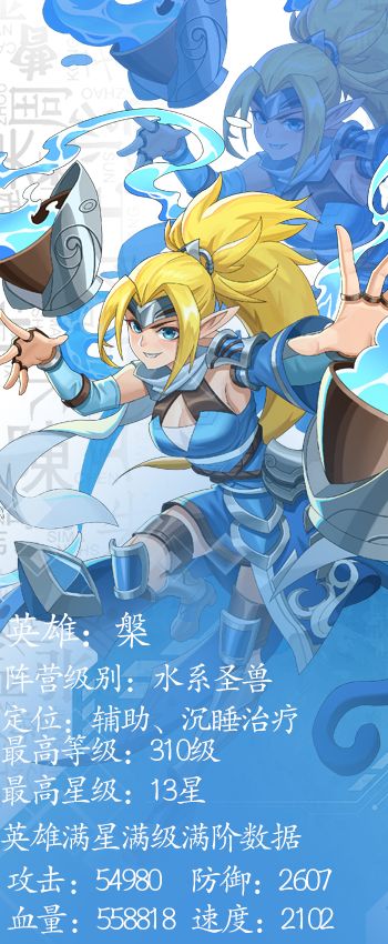 槃,意为盛水之盘。我们应该把爱当作水,装满以使其能洒满每个角落。 -槃 【槃】 昵称:长右 人设:长水润世 定位:沉睡治疗 职业:辅助 阵营:水系 级别:圣兽 【人物传记】 清冽的山泉自岩石间隙缓流而下,溢出了水桶,槃被那水滴落地的声音叫醒,睁眼发现太阳已经半沉入远处的地平线,惊得她慌忙起身托起水桶就往山顶走去。 这座山叫槃山。不是因为槃住在这里这座山才叫槃山,而是因为这座