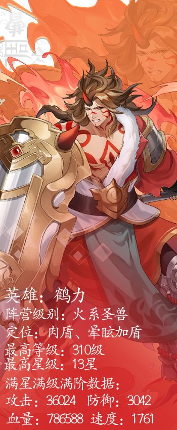 这个真有点沉……是我爹留给我的好像是有点太重了。 -鹤力 【鹤力】 昵称:夔牛 人设印象:苦侍焚命 定位:晕眩加盾 职业:肉盾 阵营:火系 级别:圣兽 【人物传记】 流波之山,海中孤峰。 雷声轰鸣,暴雨飘摇,汪洋中的孤山之顶骤然闪起耀眼的白色光芒。在光芒的中央依稀可辨一雄伟的身影耸立着,那身影张了张口,流波上空聚集的云层便被突如其来地雷霆之音震得四散开来。 鹤力低下头无奈地轻叹一