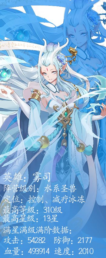 我宁愿相信一切,也不愿再相信世人。唯有风雨能告诉我什么叫感情。 -雾司 【雾司】 昵称:计蒙 人设:止水湎梦 定位:减疗冰冻 职业:控制 阵营:水系 级别:圣兽 【人物传记】 雾司从沉眠中醒来,回想着刚刚的梦境有些出神。 她梦到了乘霄。已经不知道过去多少年了,自上一次与他分别后,而方才梦里的场景却正好是她与乘霄最后一起赏花的那天。那天,乘霄带着她漫步在林中,空气里隐约的花香让雾