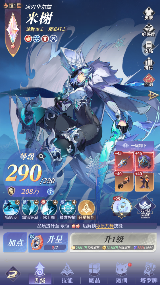 终于有了属于自己的第一个永恒守护者了,今天东拼西凑终于把寒霜守护之魂凑齐了,然后就迫不及待的把米榭升到了永恒,该说不说这永恒的彩色标志还挺好看的。
