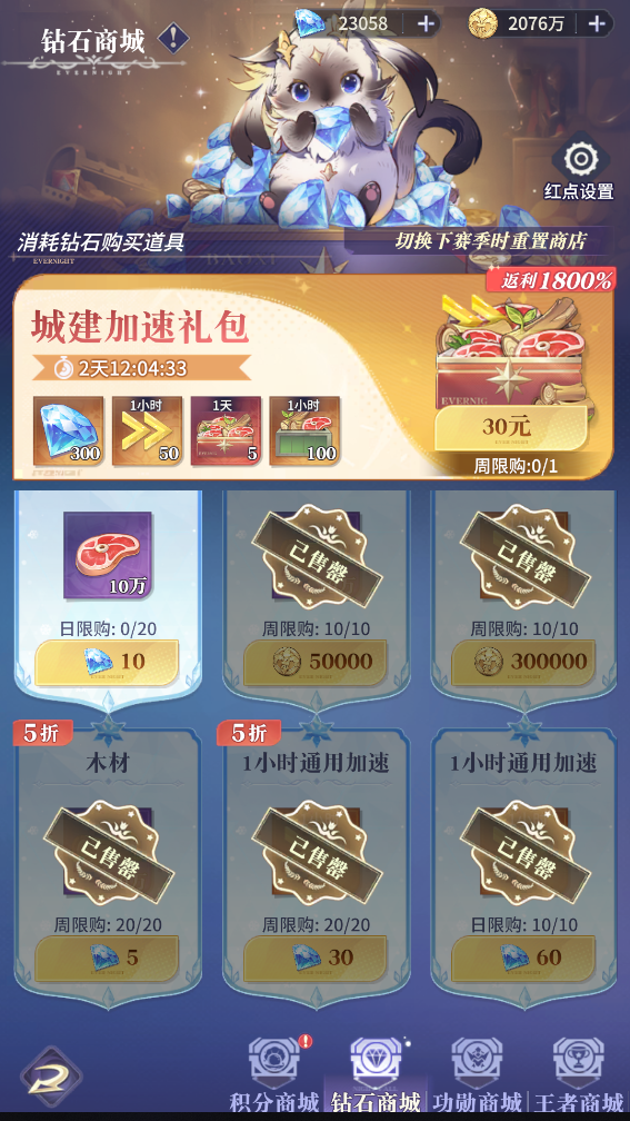 所有的加速道具我都买空了,今天都被我全用完了,现在域外探险里的建筑都加不了速喽,建筑升级都要等十几个小时,不过一周一刷新,只能下周再买加速道具了。