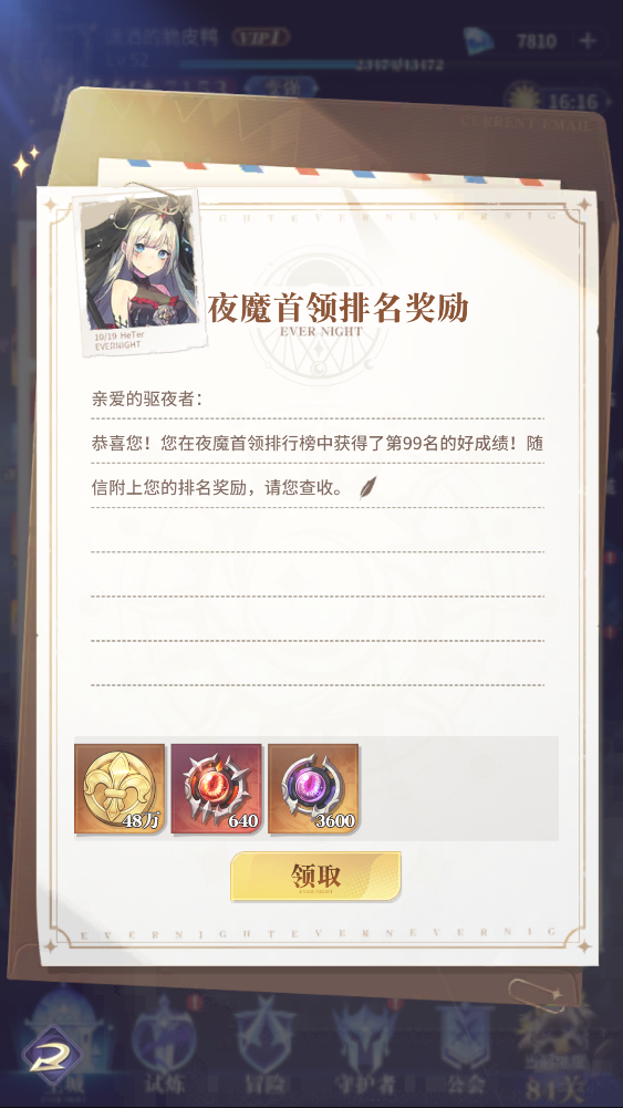 经过几天的努力,居然在夜魔首领排行上榜了,我自己都没注意到,今天进游戏在邮件里面发现的,虽然只排99名,但还是有点小开心,哈哈哈哈哈。