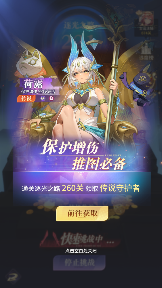 逐光之路打到260关可以领传说守护者荷露(保护增伤,召唤复活),我现在已经打到230关了,很快就能领到荷露喽!