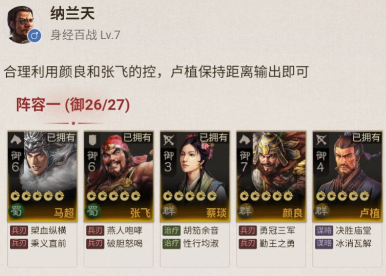 “全民配将官”招募活动已持续六日,活动期间,不少民间配将大神崭露头角,贡献了令人拍案叫绝的自研宝藏阵容,让大乔都应接不暇~本期就为大家带来入选官方认证配将官的“纳兰天”的投稿阵容——由马超、张飞、颜良,蔡琰和卢植组成的开荒队,让我们来看看它在一众阵容中脱颖而出的妙处所在! 阵容优势分析 第一,阵容在战法牧的稳健体系之上,还融合了控制拉扯流的思路,将控制能力补充到阵容中!张飞和颜良双控有效提高了开荒
