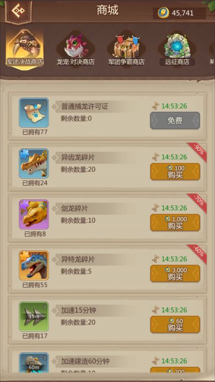 兑换商城共分为:军团对决商店、龙宠对决商店、军团争霸商店、远征商店、稀土兑换商店、飞艇商店以及钻石商店。 军团对决商店:在角斗场中军团对决挑战其他玩家和每日排名奖励来获取兑换货币,可以兑换异齿龙、剑龙、异特龙碎片、以及各类加速。主要兑换异特龙碎片以及自己所需的加速。 龙宠对决商店:在角斗场中龙宠对决挑战其他玩家和每日排名奖励来获取兑换货币,可以兑换各种资源、、水晶惊喜宝箱、训练加速、治疗加速、