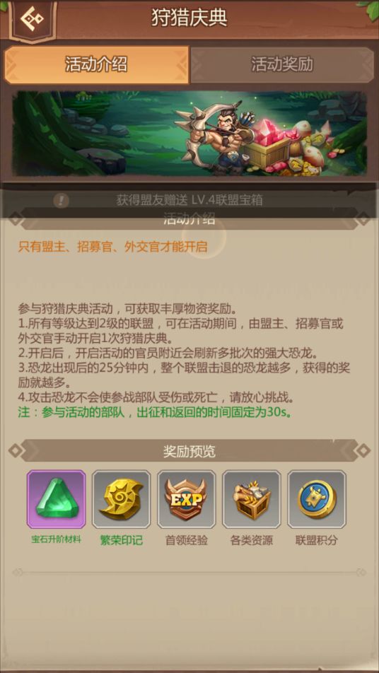 一、活动时间选定 狩猎庆典需要加入联盟才可以参与,活动开启当天由盟主,招募官和外交官手动开启活动。由于是整个联盟参与的活动,建议安排在晚上8点至10点间进行开启,确保各个成员都有空闲时间参与。 二、活动奖励 狩猎庆典可以获得宝石升阶材料、繁荣印记、首领经验、各类资源和联盟积分。活动奖励依据联盟完成击退的恐龙批次获得。完成击退的恐龙批次越多奖励越多。比如完成击退第5
