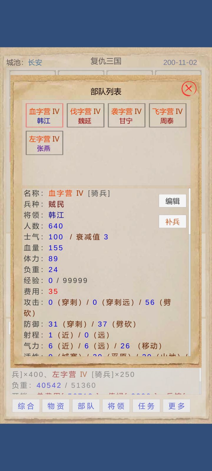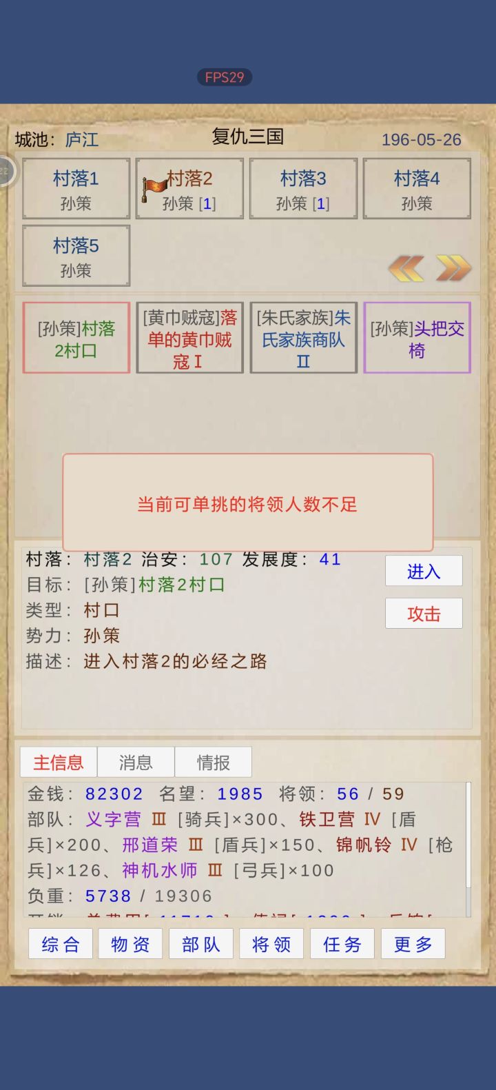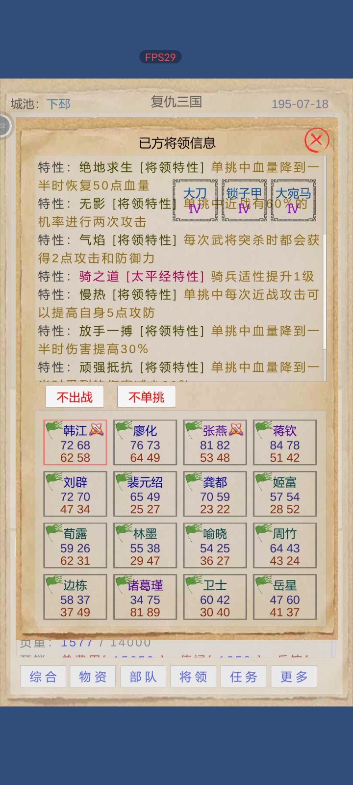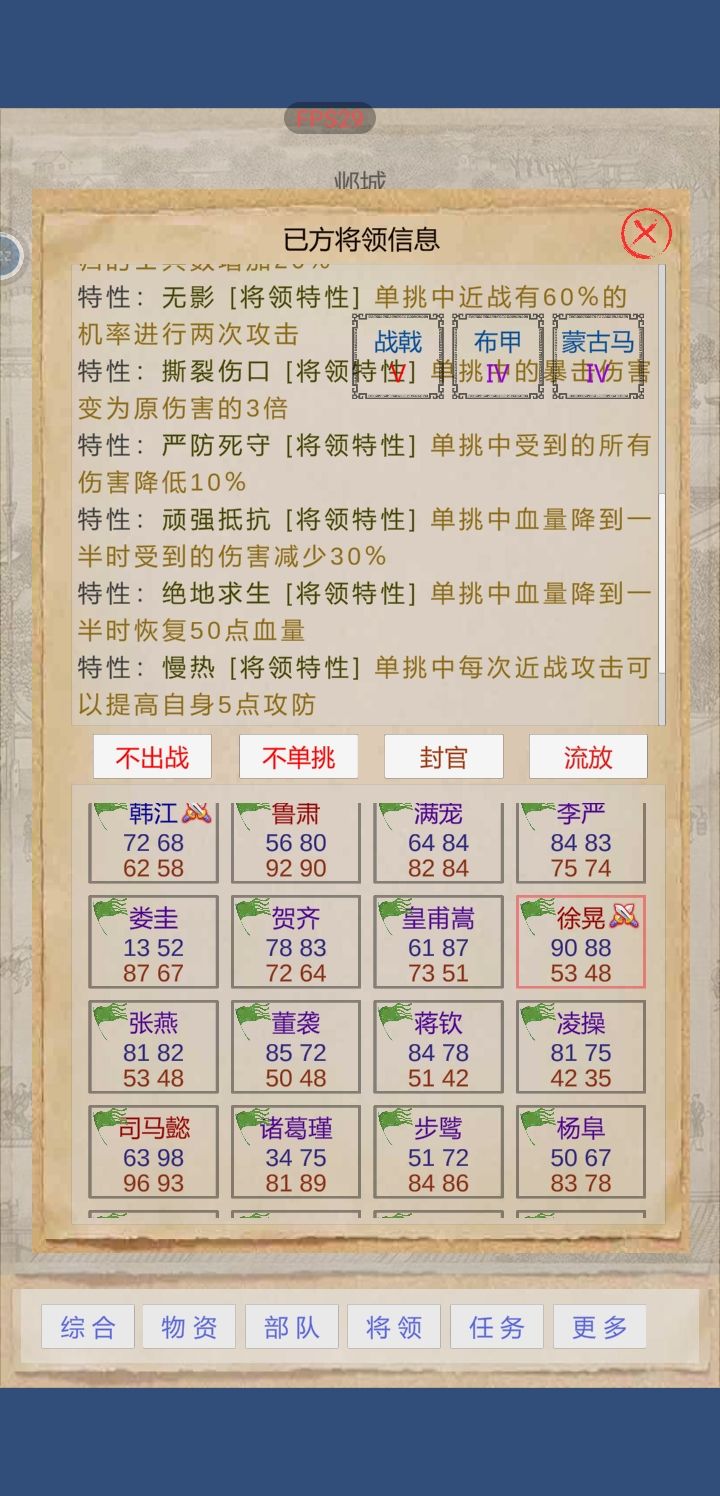 先武将招满,能打工赚钱的都行,这段要花点时间,然后才开始游戏,单挑用徐晃(店里招的),主角还是以打兵为主。