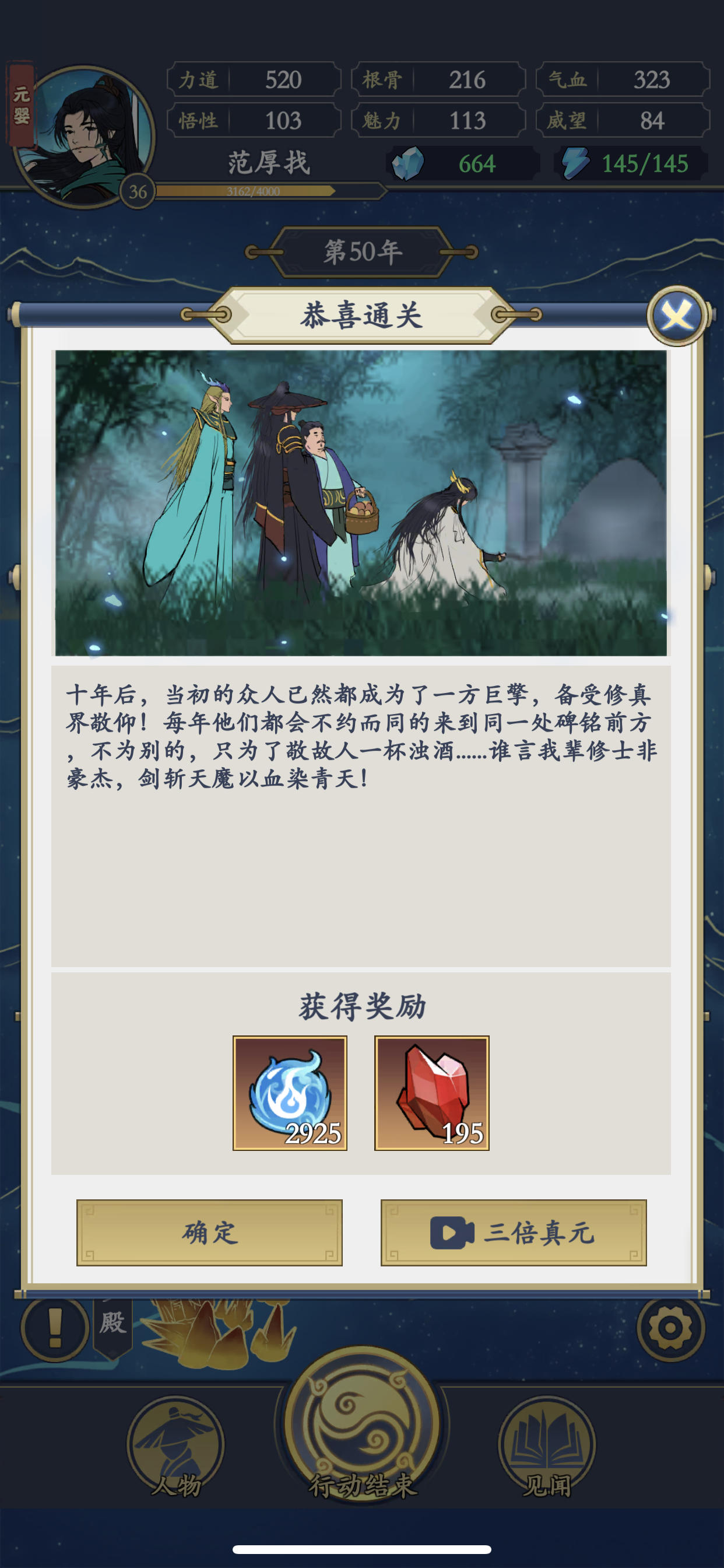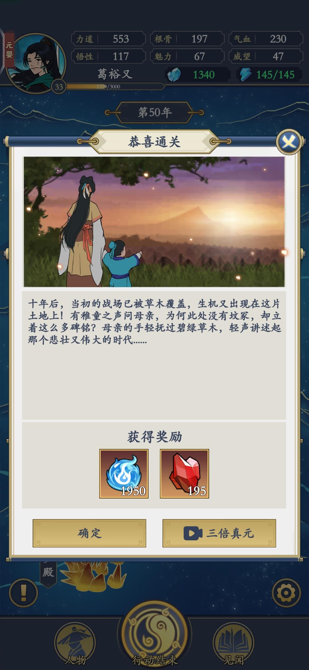 元婴期就通关了,我很纳闷难度1,还是比较简单年数:50年境界:元婴期装备:全部橙装就过了等级:通关时32级(尽量把全部怪刷完)属性:初始属性别点生命和护盾(难度1没什么用)技能:全部攻击技能(除了不暴击增加攻击的技能),再加1个护盾恢复队伍:1个地图只能召1人,好感度1级自动入队,3级不用再刷了