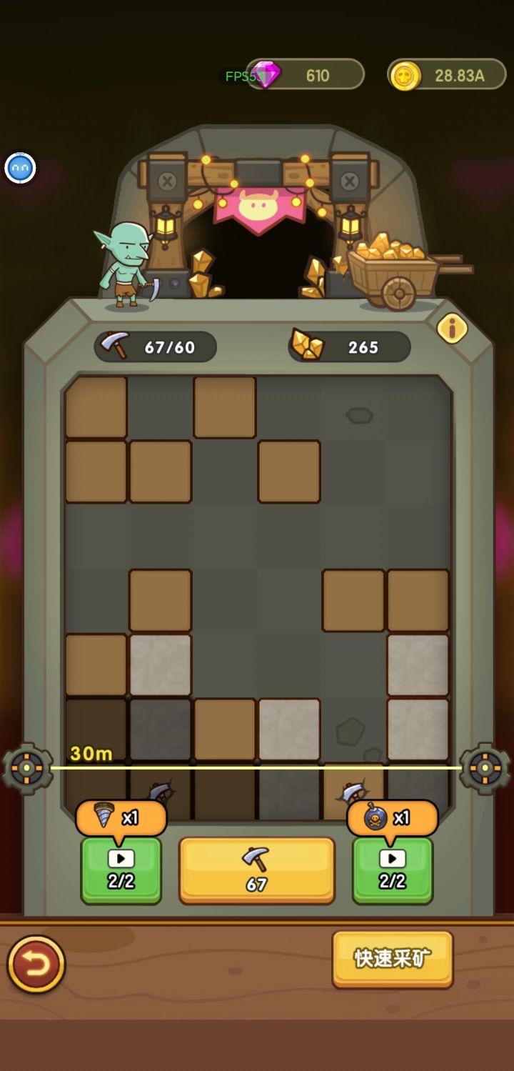 然后图标,挖矿是挖最下面一行才能进一步往下,但是提示看广告的图标一直挡手挡视野😭我看还不行吗😥