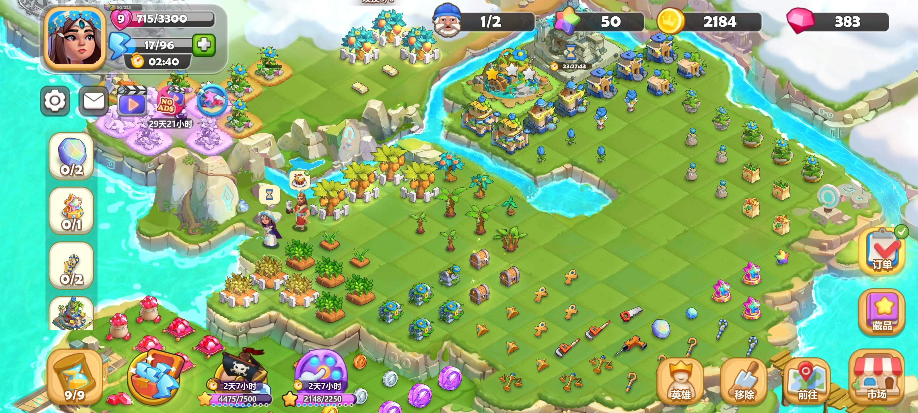 其次第二点就是你合出来的那个花,那个草地的那个花为什么不能移除啊?你有移除的功能,你只能移除那些可以合成的东西,然后你就不能移除那个不想要采集的花(请看截图,图里面绿色的是一定会合成出来的占格子的,橙色的是推图的),然后结果我开出来的那些花合出来的那个草地,我如果不去采集它,它就会一直一直占着我的格子,越来越多越来越多,而如果你想推主线任务,你就要去采集那些橙色格子的那些那些花,那些花的收益也更高,价值也更高,当然耗的体力也更高,所以说我现在的格子几乎是不够用的状态,因为这个游戏是三个可以合一个,5个可以合两个,很多的东西你都要在地图上放着三个甚至4个,这就不得不说这个游戏的第三个问题,你就不能够给我来一个这么多种不同格子的一键的分类?每次都一定要把所有东西放到一块,所有东西放到一块,然后呢这个地图又大,我如果缩到最小,我去拖拽那个东西就很麻烦,有时候不小心拖歪了,比如说我现在我我现在场上有5个,我把第4个放到另外三个的旁边,一不小心拖歪了就合起来了,浪费5合2的机会了,就很恶心,甚至现在地图刷到最小,有时候东西我想从我现在已有地图的一边移到另一边都得先挪到中间,再挪到其他地方,操作两次就在这种情况下,结合我刚刚说的那些占格子的真的折磨。你主线的那些金色的,橙色的泥土的花,你采集七八次才能够移除一个,然后采集到后面都是十几二十的体力根本就不够用,你的体力一共就七八十,你如果不看广告,根本什么都干不了,而且后期的话都是20多体力一个,看一次广告,拿20体力,看一次广告。点一下采集,看一次广告,点一次采集,我一直在看广告,毫无游戏体验,所有的东西都感觉在折磨玩家,我真的建议要么你就别玩,你要玩的话,你就忍。