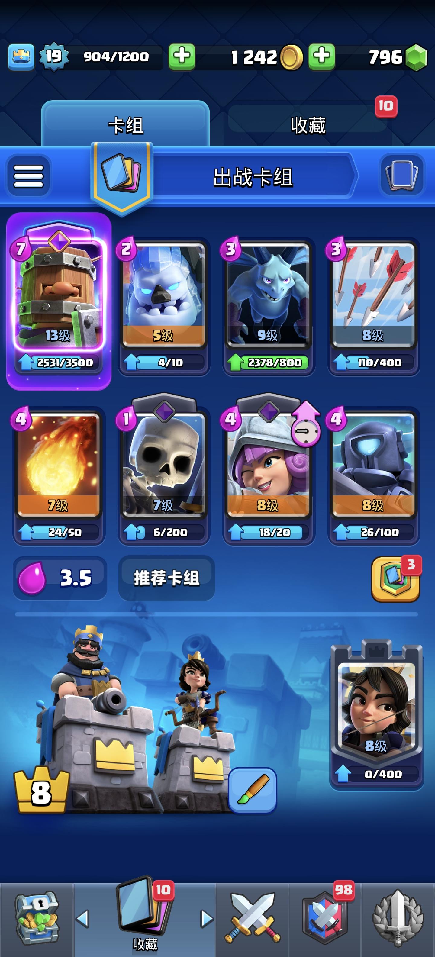 无限圣水的卡组推荐来啦 卡组如上有几个要点1.大骷髅看哪边兵多放哪边2.镜子只能给卫队,给其他会崩3.游侠烟花靠后放4.天使直接中置过河5.下牌优先级:卫队>镜子卫队>大骷髅>烟花>天使>游侠>飓风>火球 记得记得,这套牌打的是桥头攻陷,不要沉底(当然你开局手里没有卫队和镜子可以沉底过牌),烟花游侠死了没关系,两秒给你刷个新的。双后排建议不要放靠在一起,免得箭雨+镜子箭雨全部扫清光。这套卡组很不好