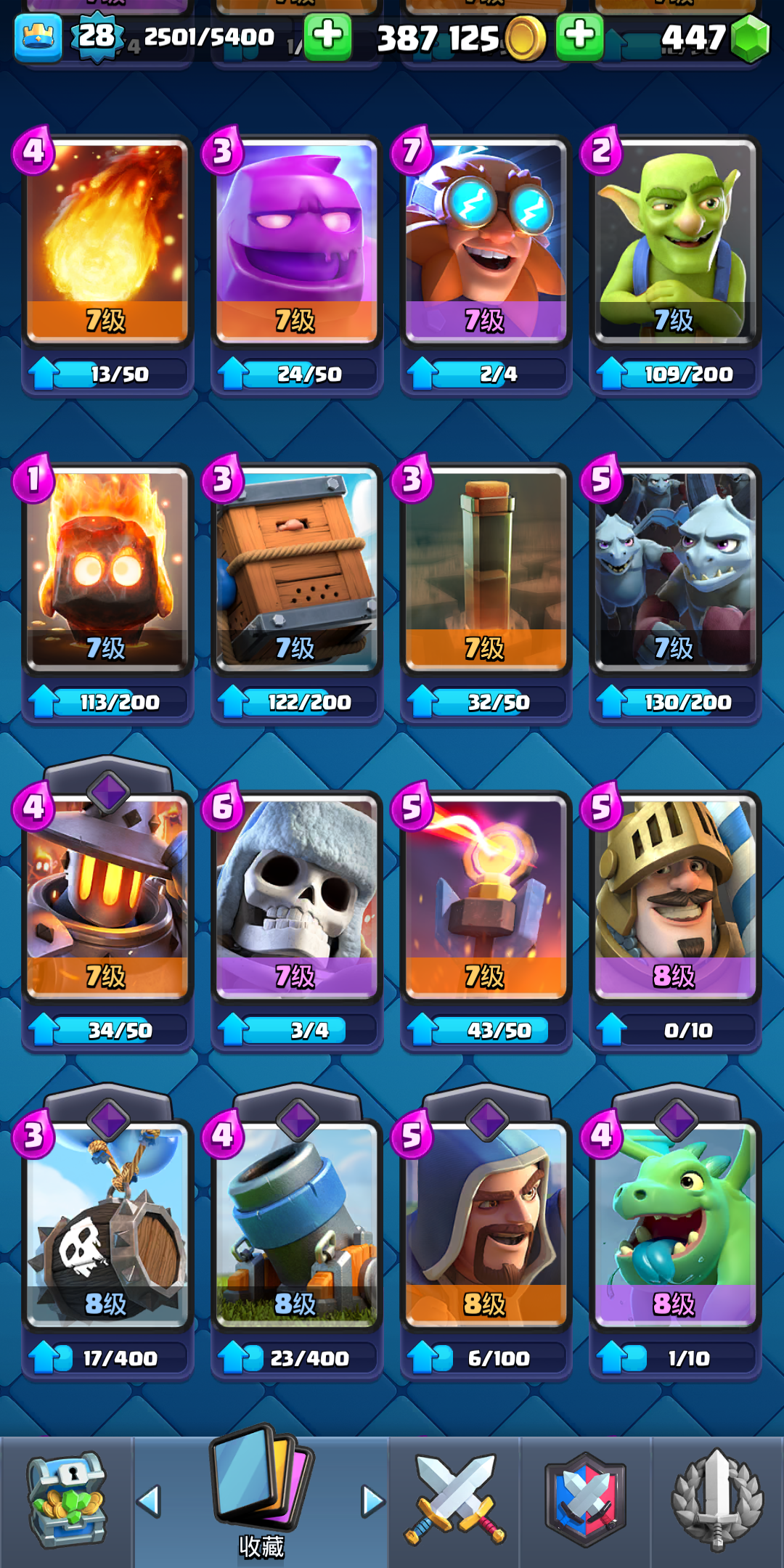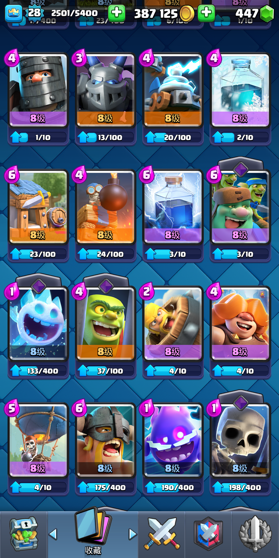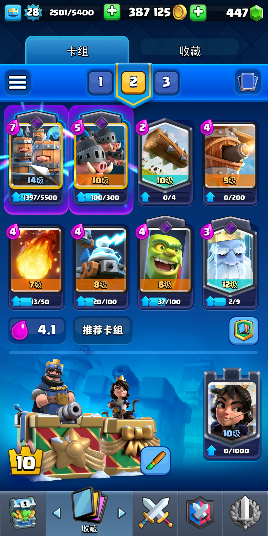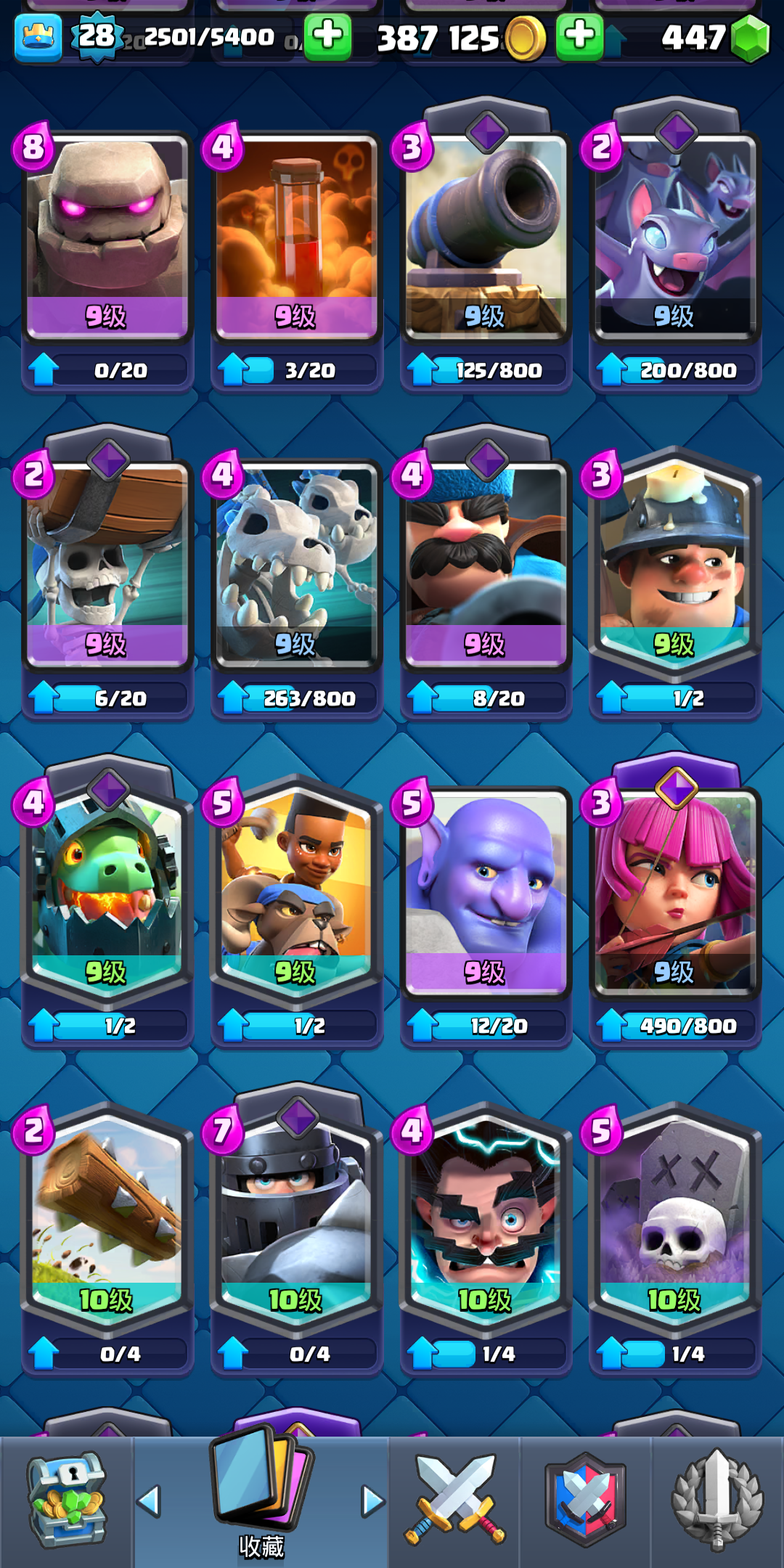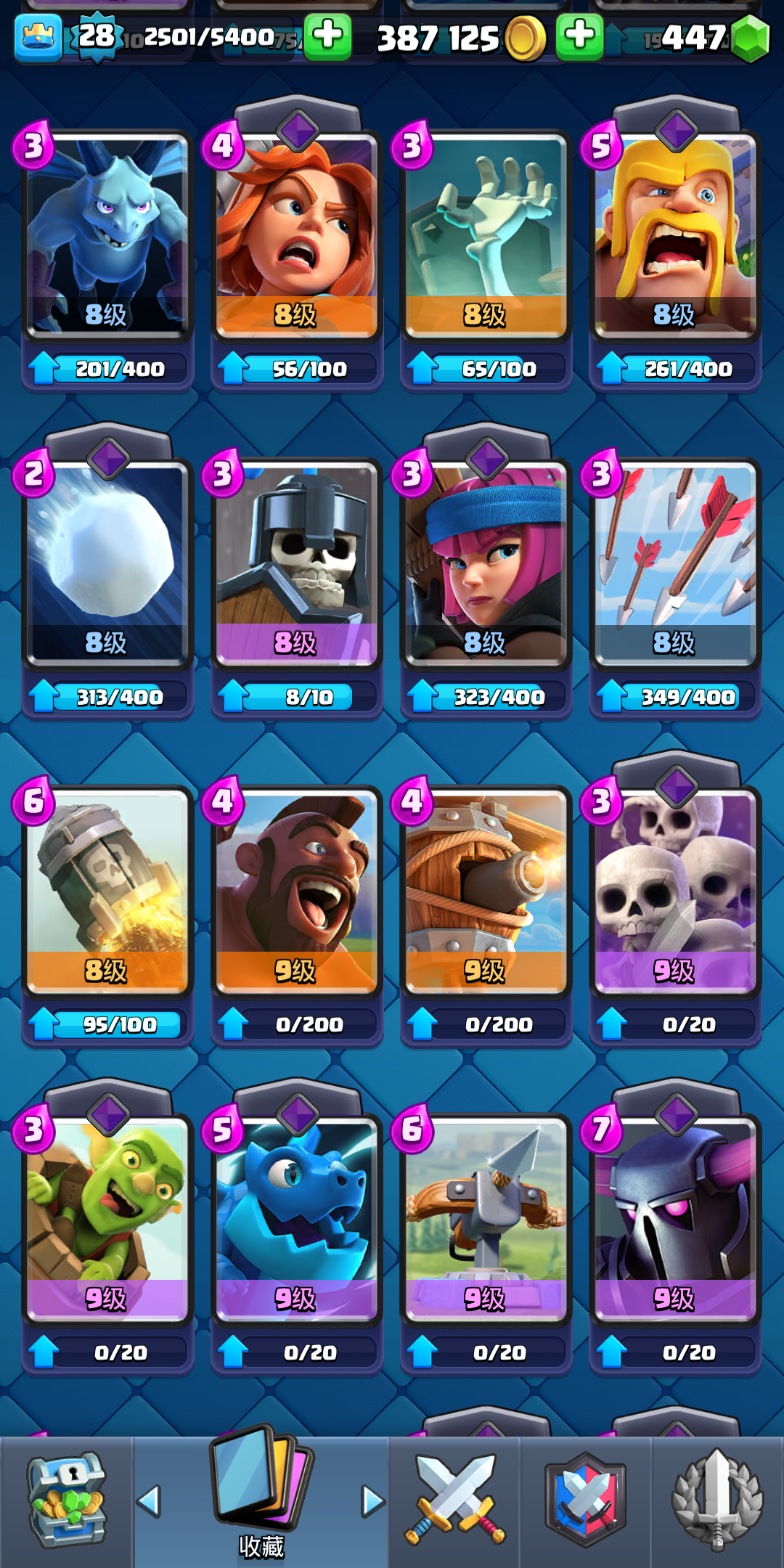 回归几天的小登,目前最高配置了,本来才平均11级卡组,宝箱出的外卡拉了拉等级才上的9500,打的太辛苦了胜率才六七十,觉醒太离谱了,经常一个觉醒直接逆转局势