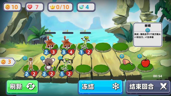 《口袋小黄鸡》游戏画风非常治愈,玩家可以挑选超萌的小动物组成自己的战队来进行自走棋对战,连赢十场就算吃鸡成功。小动物们都有着自己独特的属性和技能,玩起来十分有趣。 这是每回合的配置界面,画面左上角分别是金币、剩余血量、胜利场次、总回合数。 金币可以用来购买小动物和食物,都是固定消耗3金币(个别道具例外),每个回合开始都会给你10个金币,没花完也不会累积到下回合。出售战队里的动物可以获得少量金币