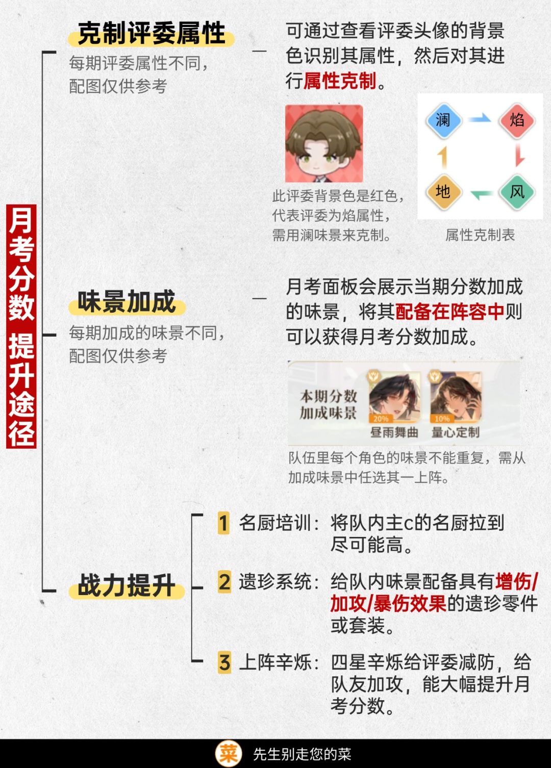 月考分数提升途径有三: ①克制评委属性 ②上阵加成味景 ③提升味景战力 #维斯塔的餐桌 #维斯塔的餐桌攻略
