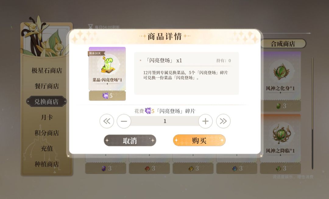 一些容易遗漏的限定菜品整理~ 1.12月限定菜品已经上架商城啦,依然是签到就可以获得,在兑换商店的合成商店里 2.学期特训限定菜品,还有20天结束,想要集图鉴的特招生可以考虑购买 3.新活动的两个菜品,获取门槛不高,特别萌