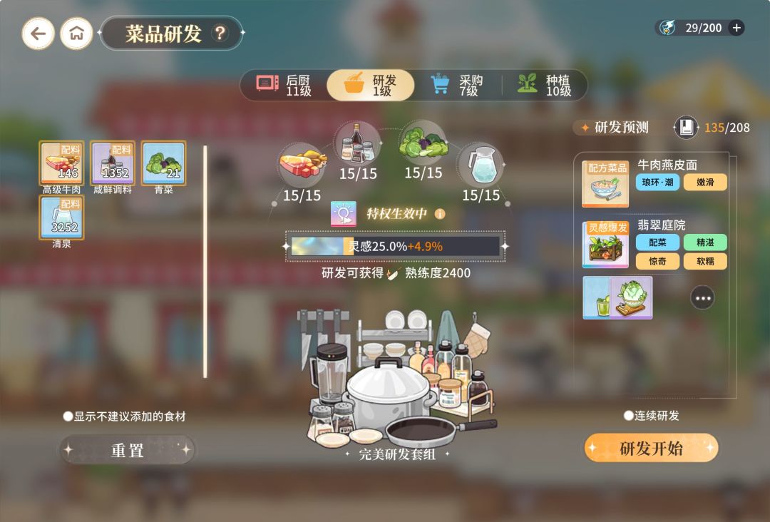 本篇的主要作用是消耗采购多余副产物:奶制品、蛋类、清泉、虾蟹、牛肉、猪肉、鸭肉、鸡肉,以及咸鲜、甜味、酸味以及风味调料 4级采购新增河鲜 原理是挂机刷灵感、熟练度和碎片,菜品五星后会给万能碎片,万能碎片可以用来提升其他菜品的星级,从而提升战力,但灵感值疑似存在1000w上限(已取消100w上限),金币自由后可每天买满食材商店所有商品,你会发现金币越花越多根本花不完orz 紫色厨具: 甜味+奶制品+
