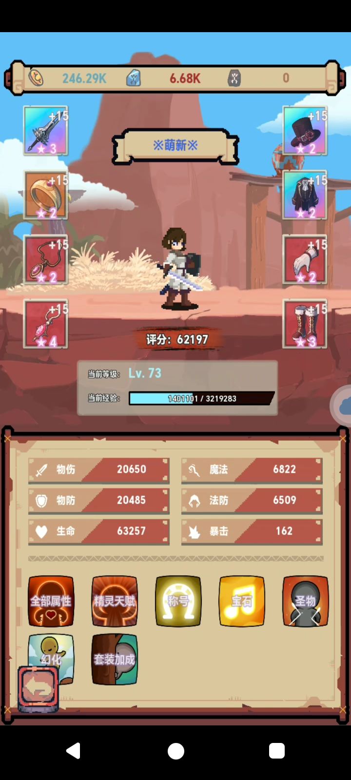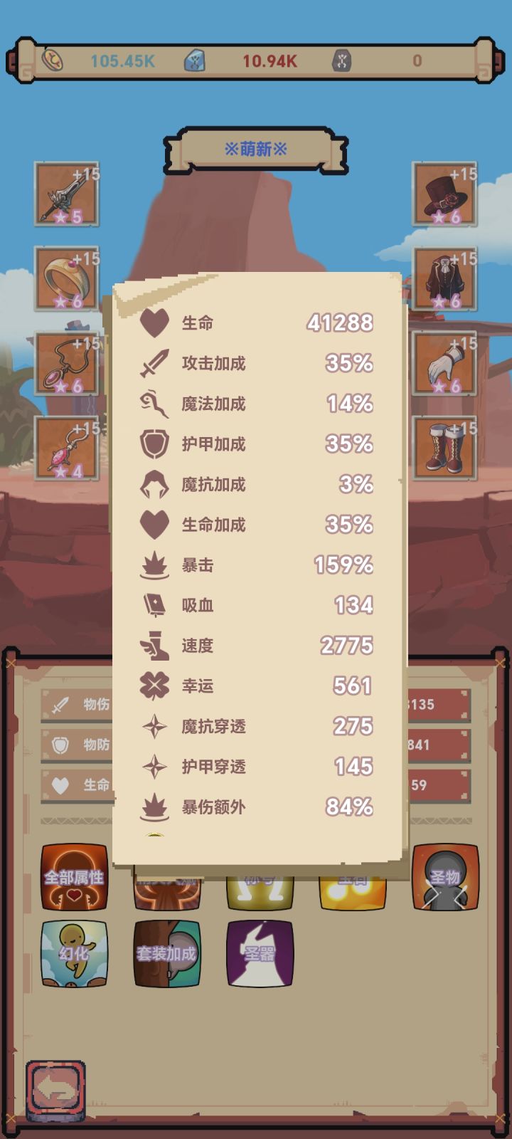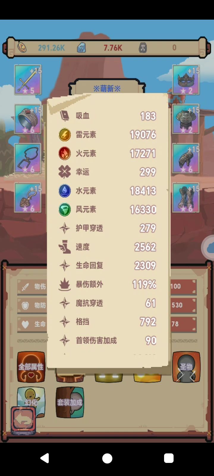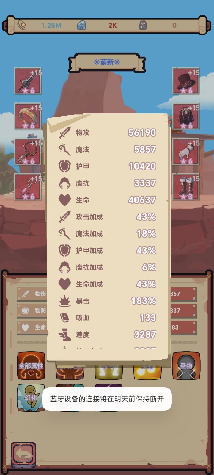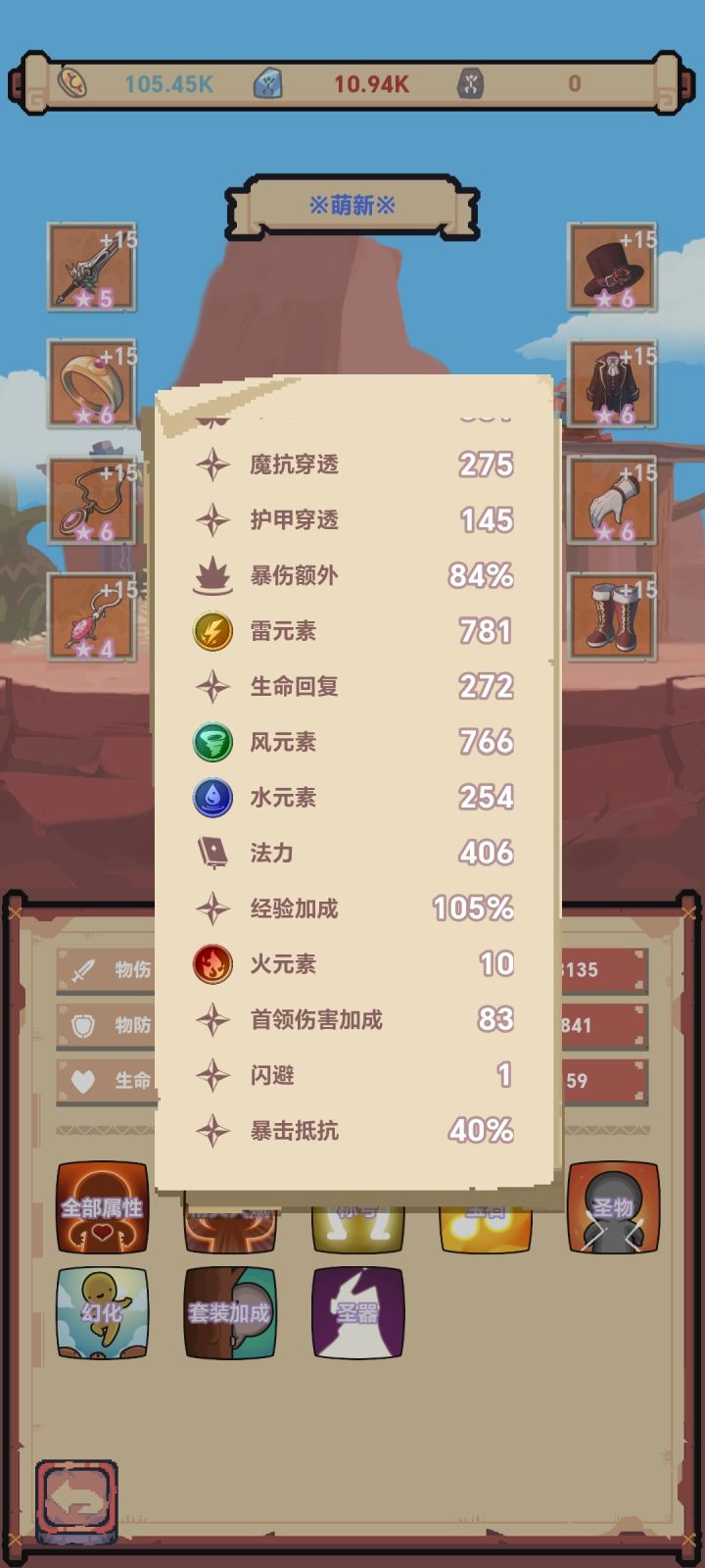 魔法这个号一天多一点,说实话,打造成本很低,当前版本改版后,运气好一天的号就可以上401了,以下一到四张图片为一天多的魔法流图片,魔法书除了过渡升了点转生其他均为一级,羁绊未满,当前层数为343,还在推进。物理打造成本很高,五到六为物理号的属性图,这个号是最开始的号,因为偏爱物理,所以想试试物理的极限,目前层数463,还在推进,但是速度极慢,就赌新星的概率,靠封心不是被秒就是秒怪,两秒男。还有多提