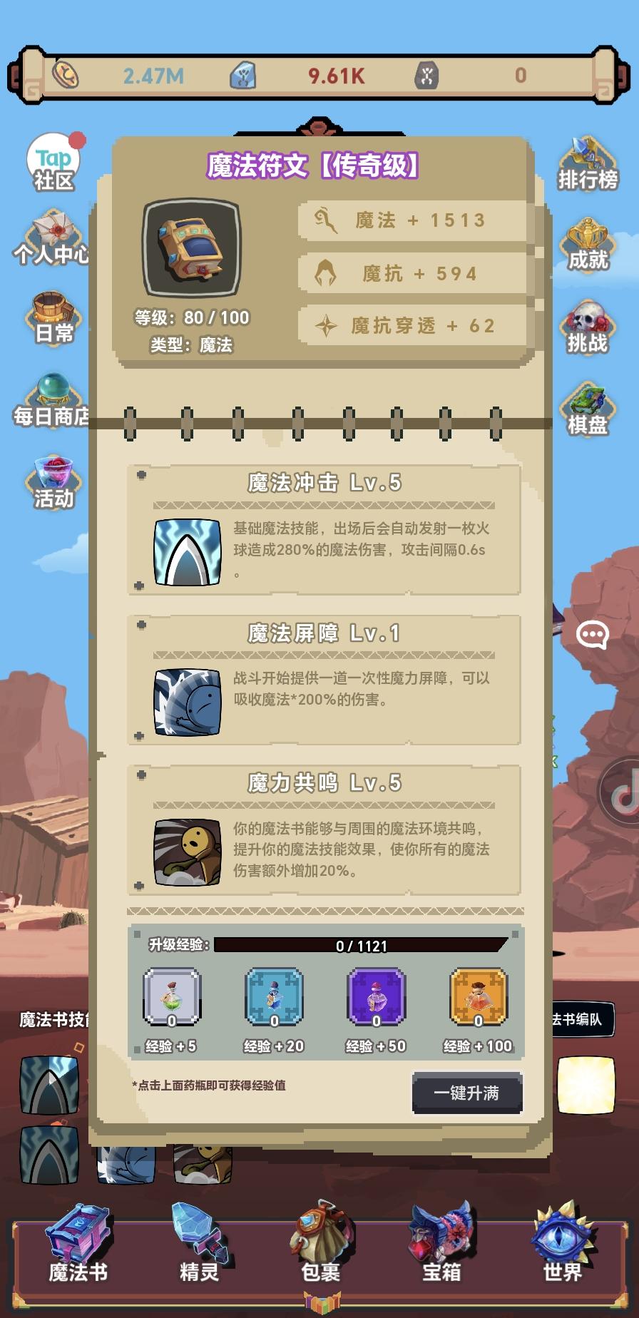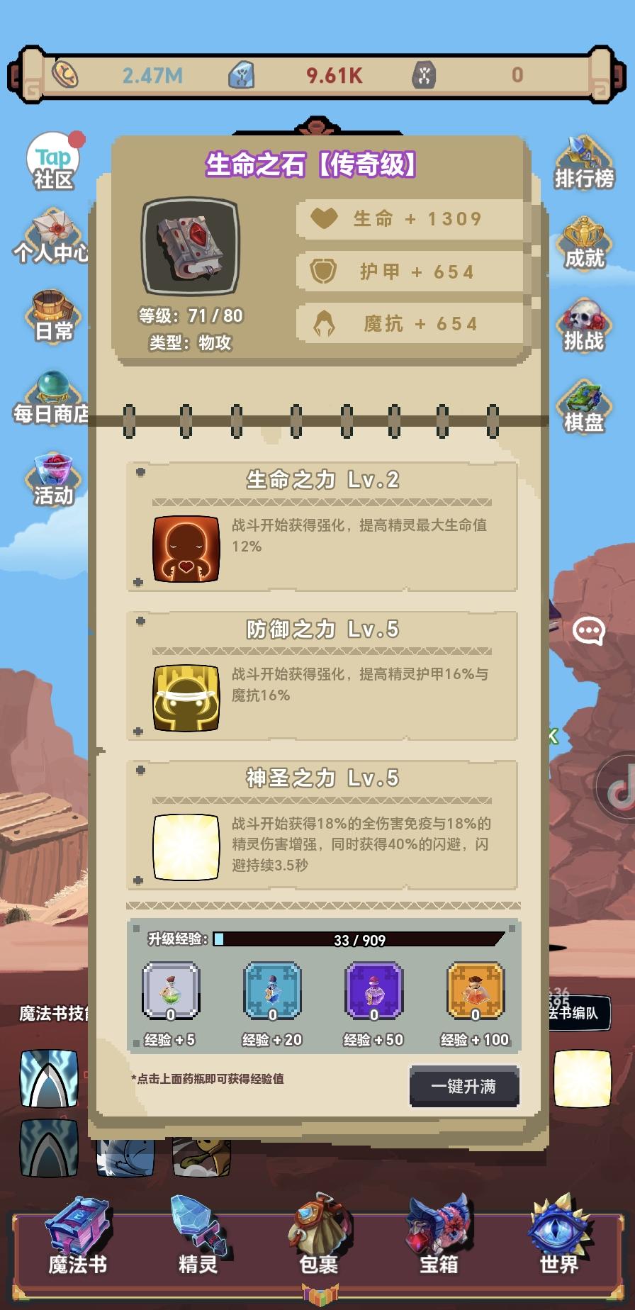 作为一个要那么久踩坑那么久的萌新,我要告诉大家我踩过的坑。 圣物看清楚上限有几个,随着等级提高会增加,千万不要选多,选多了不出来还会把格子吃了导致少一个圣物,还会打乱圣物的节奏甚至重选(我的4W多砖石QAQ) 魔法书的属性不用上场,升级就有了,优先升级旅行日记,但是不用上场,等级跟魔法书技能没有关系 打600级BOSS才开始需要选抗暴 万能石够当前用就好,不比多买。 攻速收益很低,不用特