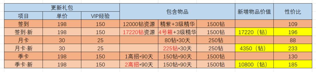 大家好这里是官服S131的Vince。 距离上次周卡更新才刚刚过去2个月,这次三周年前版本更新又加强了一大堆礼包,导致更新后的礼包性价比都有所提升,而未更新的礼包性价比相对下降。 这策划还趁着版本更新前一周投放了一波资源补给,他们也知道等版本更新后这些礼包都不会有人买了。尽管我已经感觉出了不对劲,结果还是被骗了一个30一个68。 附: 新旧礼包对比如下: 月卡和季卡:这个就不多说了月卡收