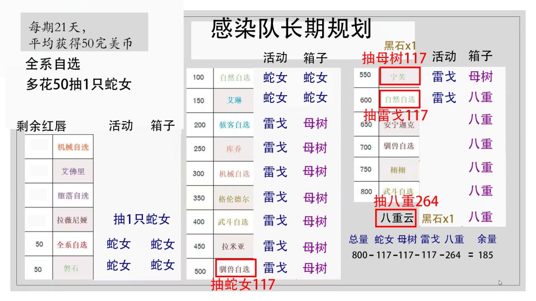 抛砖引玉 前言,零氪也不能等憋出猴子就弃游吧… 楼主六十四区(现138红唇),根据两张图(剽窃)规划到明年全up攻略,可以根据自己红唇适当调整。 图一得出,明年全up可以攒1100红唇,以此规划出两红带候整容,默认黑石可以换一个紫,换三到四次 攻略一:拉斐(免费白嫖),一拳(运气差就会来每月一个,拉菲后嫖红),0弗利萨两次抽红(80+362),老头,一绝底子猴子抽两次三绝(80+80),0龙女红(