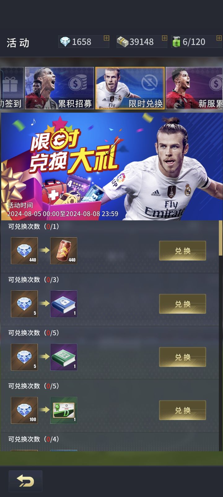 01充值返利【活动时间】:8月8日00:00-8月11日23:59【活动内容】:累充充值达到指定金额即可领取奖励累计6元:6元超值豪礼*6累计30元:扭蛋币*5,球王印记*5万,海报珍品券*5累计198元:6元超值豪礼*30,球王印记*5万,海报珍品券*20累计328元:万能碎片*60,球王印记*30万,海报珍品券*40累计648元:魔鬼特训卡*360,精英之证*5000,海报珍品券