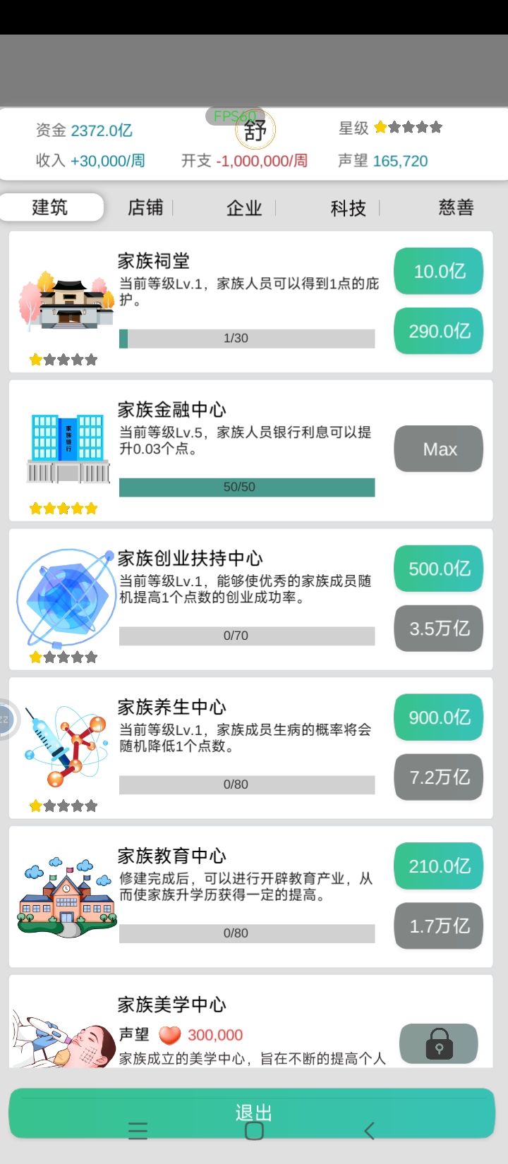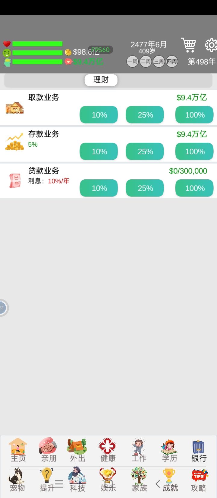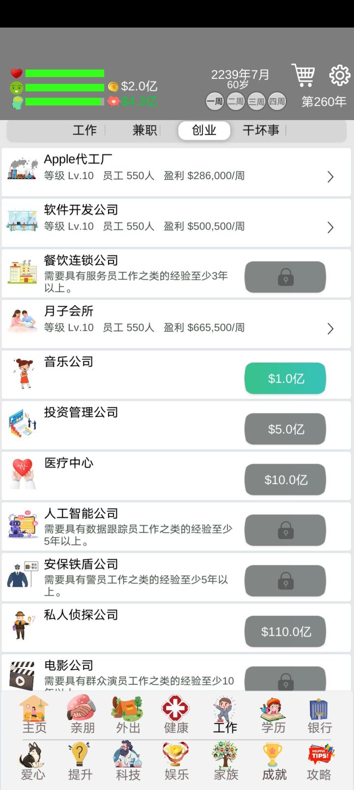 这这个游戏首先开局看广告,把商店所有得钱的广告全部看了,看了之后就开始了,上大学上那个软件的大学,然后学习对应的技能之后就当公务员,当个10多20年差不多钱也凑够了最好就是有600万的时候就可以开了 ,然后致死后的话,开了公司,你先招5个人,然后一直犒劳员工,我知道那个数值变成绿色的,然后你就可以继续招人了,一直按照这个步骤钱就有了如果有闲钱一定一定要把它存在银行那里,既不会被偷,然后也可以得利