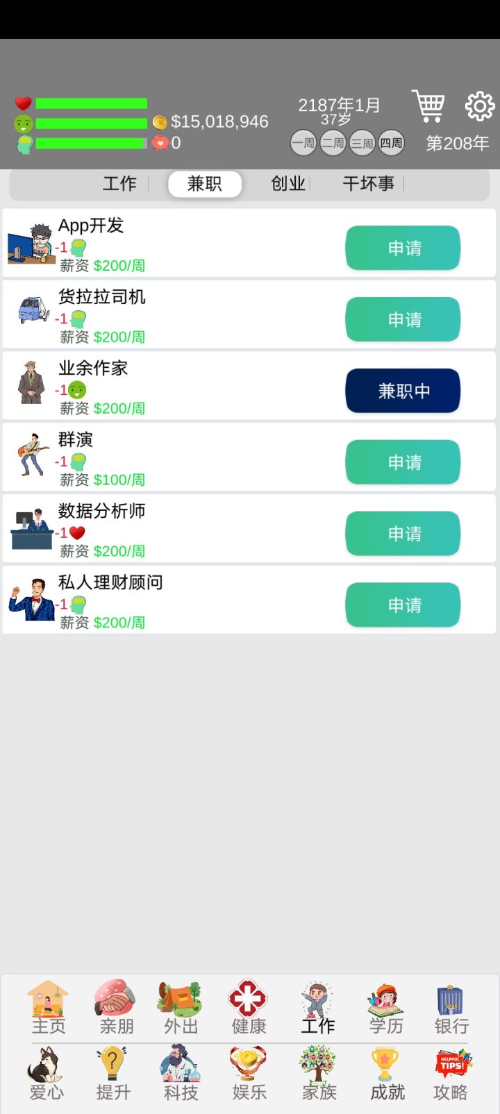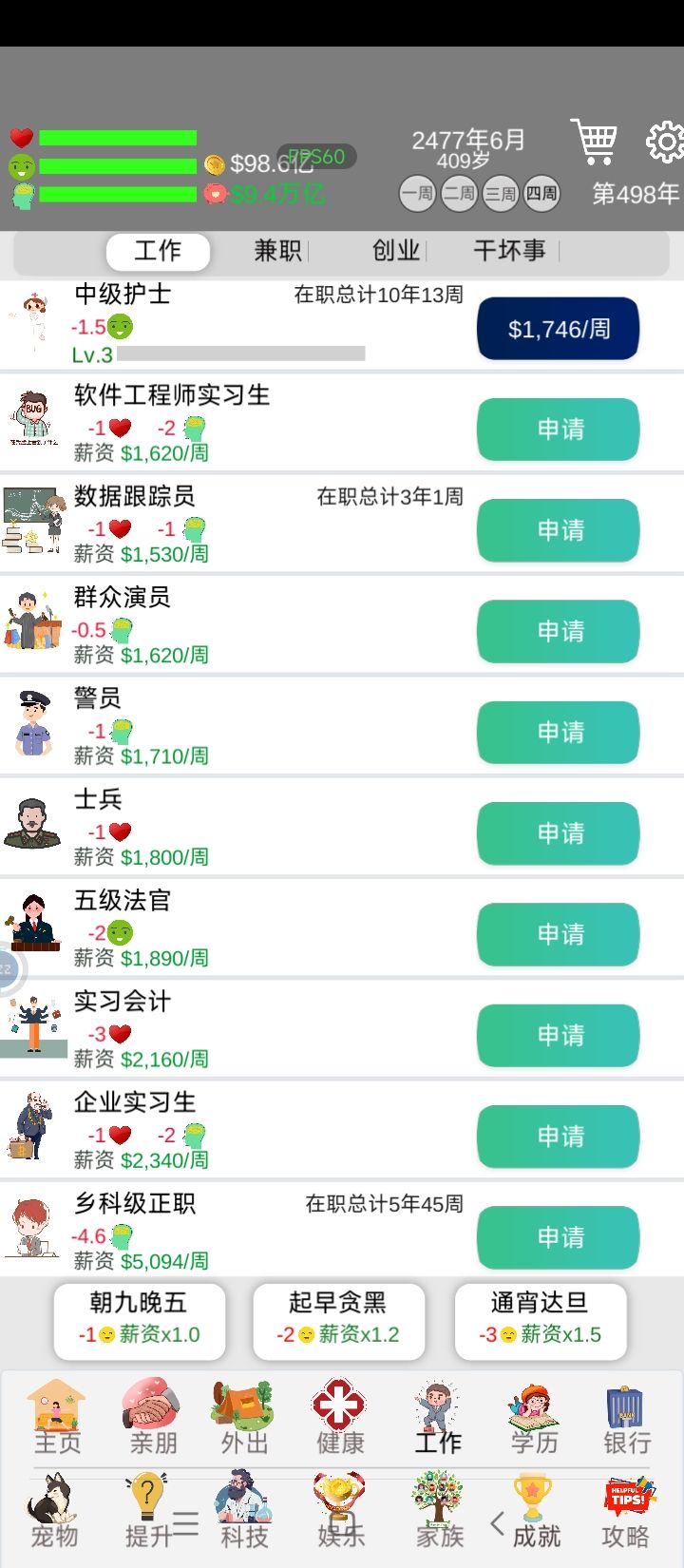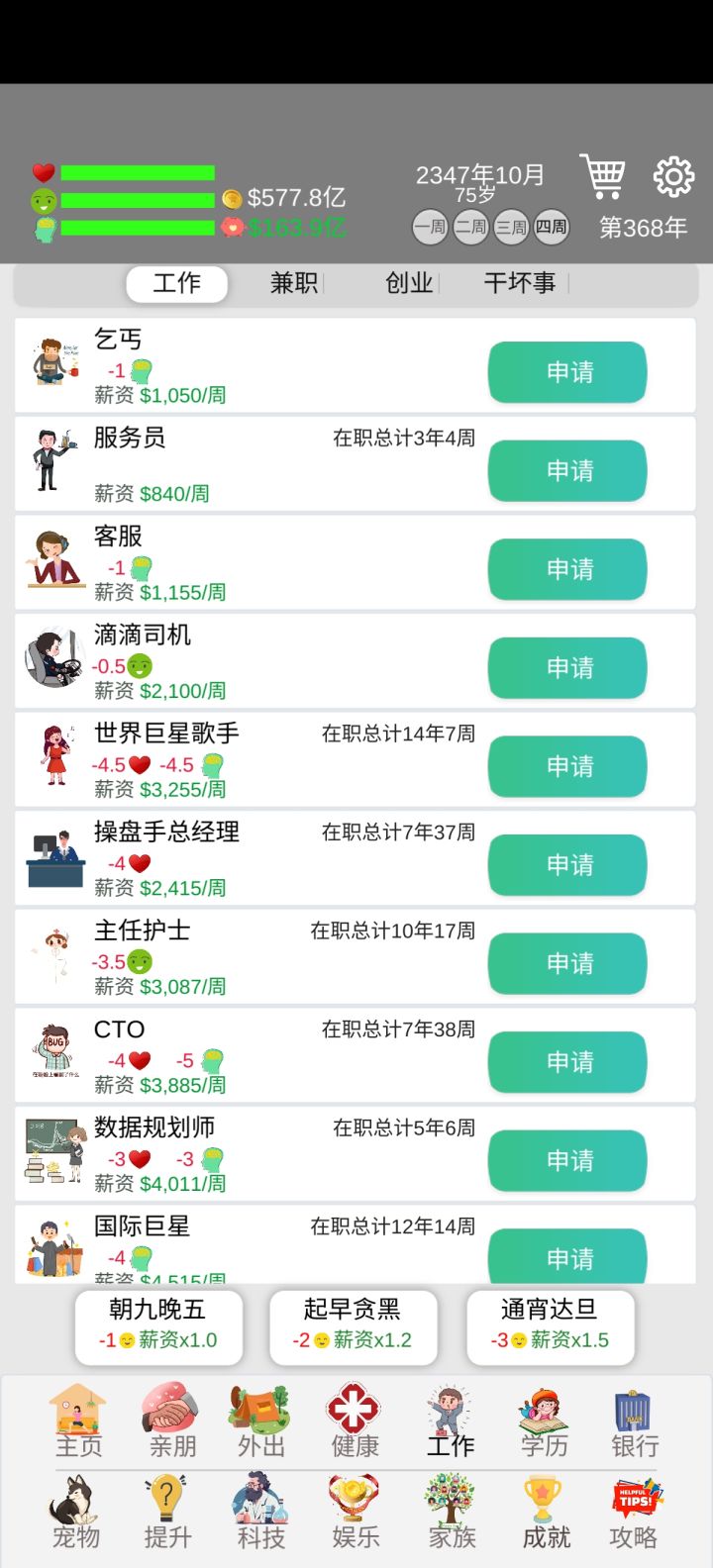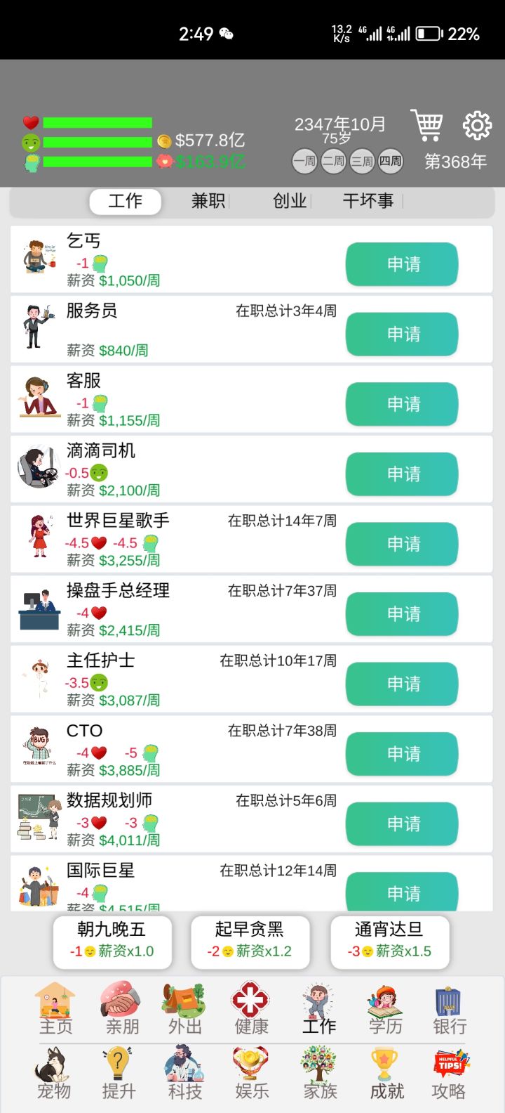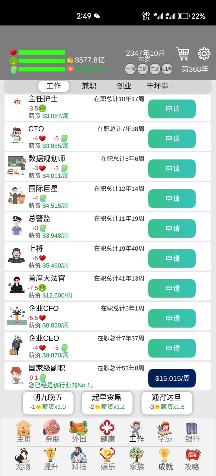 职业总结:千万别弄歌手,护士,演员,士兵,这四个职业特别坑,工资是最少的,不够日常开销,升级花费的时间,要升的级数,是除了法官和公务员外最多的。其中,歌手和演员因为外貌不够,没升到顶。天王级歌手LV7(升级需90外貌)薪资$1,575/周操盘手总经理(MAX)薪资$1,725/周主任护士(MAX)薪资$2,205/周CTO(MAX)薪资$2,775/周数据规划师(MAX)薪资
