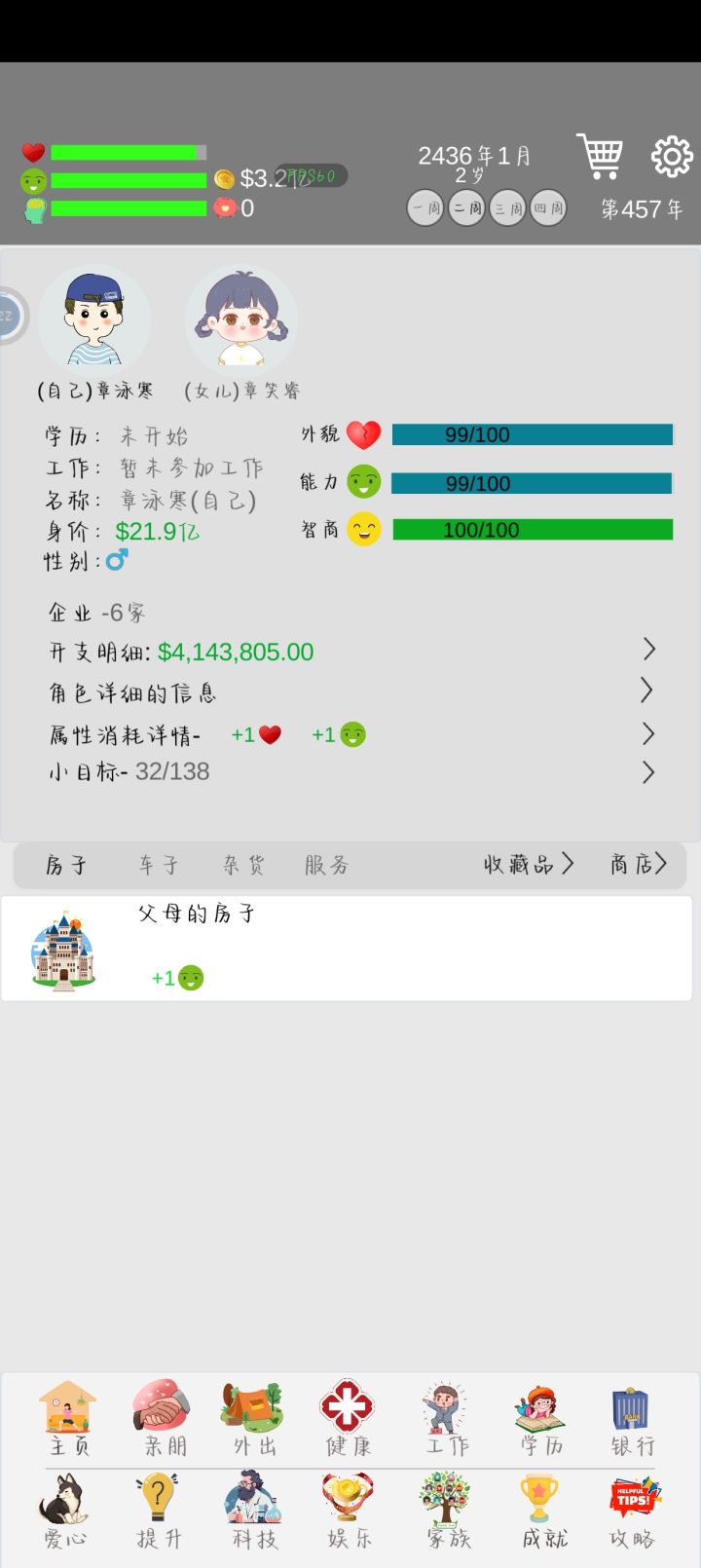 肝了几小时总结一下攻略一、前期(生存)1.看广告拿100生活费。2.看广告拿70万。3.看广告房子6折。4.18岁买房子租出去收支平衡就行了。二、中期(读书)1.去读书读什么专业都行大学本科就好了。2.技能读西餐制作。三、后期(工作)1.服务员干3年,后面创业要用。2.公务员存钱。3.边工作边收房租等遗产,钱够了去创业。四、创业1.越是前面的公司创业的钱,就越少。2.