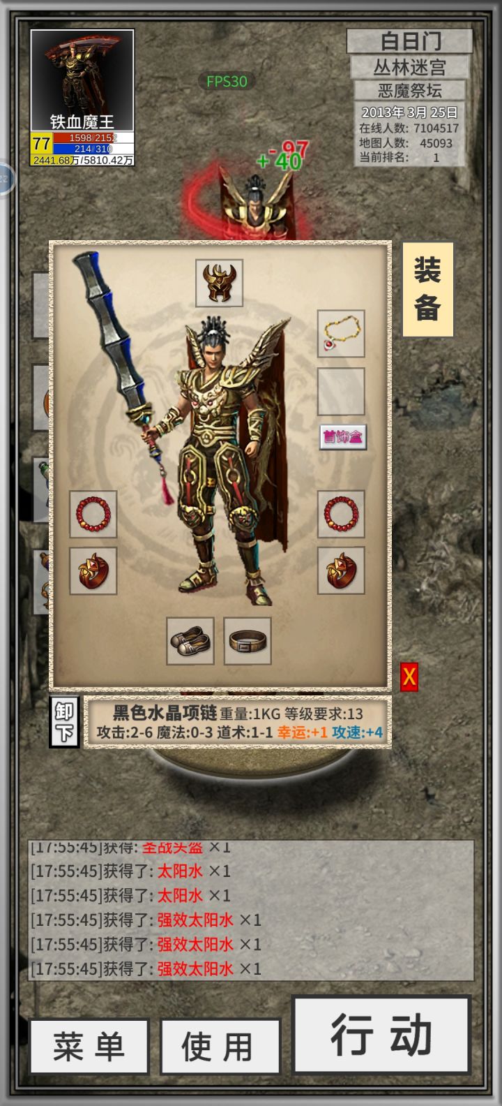 道士我不说了,玩的两天也刷了几次尸王殿,涉足不深,转投法师了。但是这次更新是不是太恶心了?以前你可以15分钟去一次暗殿招一直多角,现在直接一直失败,这就让人很无语了。