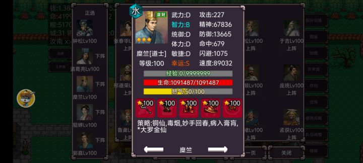 我觉得华佗也太变态了吧!我用主角和其他所有人换下了对方法系,然后华佗反伤把对方其他高攻高血全部拿下。所以只要确保华佗一回合没死,对方没有法系,基本上就没干掉敌方全部。还有就是抓赵云,我抓了几十次了全部都被逃跑了,如果抓华佗也是这样就醉了,好在运气站在我这边,唯一一次打败华佗的一次就把他给抓了。那时还是一星。华佗在手后就势如破竹的直上六星。还有就是开局不知道技能重要性,所以刷了一个垃圾辅助技能开局,职业是游侠,主力目前是主角,诸葛亮(庞统技能),华佗,黄忠,孟获(全体毒)。