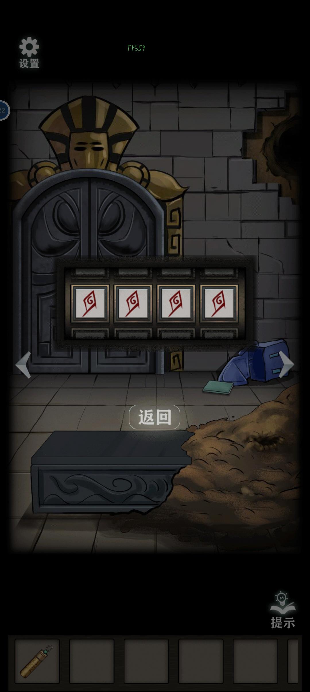 右下角机关获得石像眼珠打开地砖(后面有用)捡起图中地上的一块残片点击图中三处可以获得陶罐,残片,火折子用陶罐装水,点击石块获得锋利的石块,点击左边位置获得另一颗眼珠,点击水中获得抹布用抹布擦亮镜子,给石像装上两颗眼珠,拾取权杖用陶罐把水灌进地洞,获得印章,点击墙上得到绿宝石用石块切开石盒,用印章压上,再盖在桌上黄纸上,得到提示用火折子放进洞中,得到残片,取回火折子用提示打开石棺,