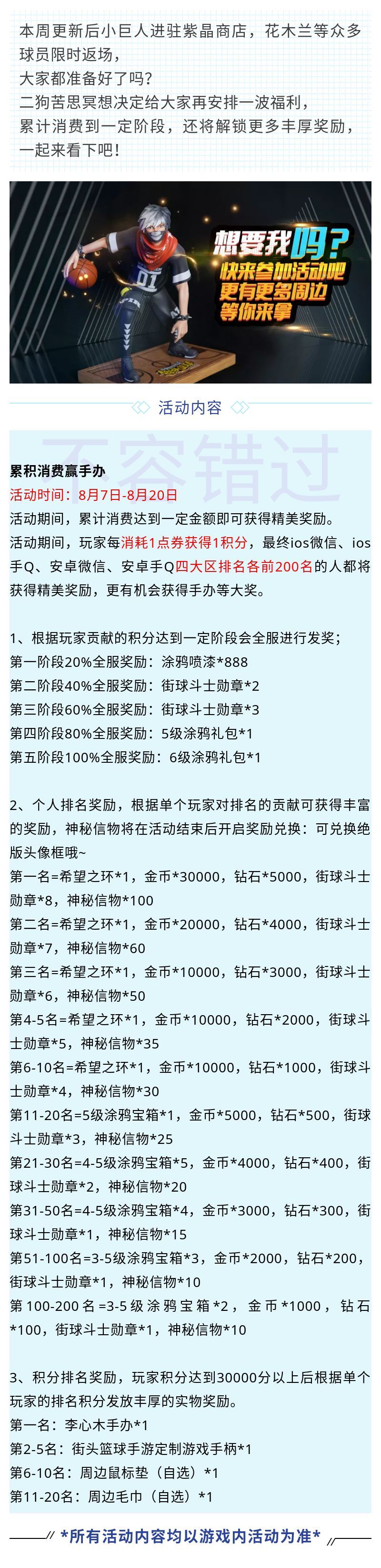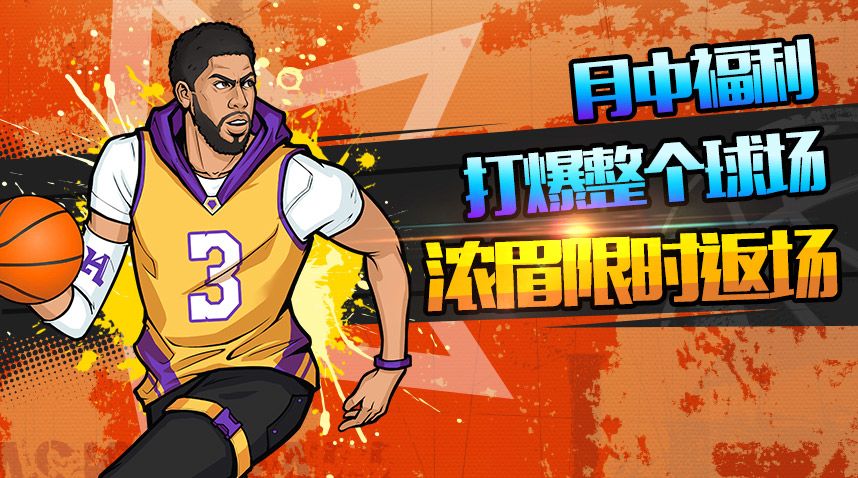 精彩内容抢先知 登录比赛有礼:三分大赛送稀有材料奖励,累计登录即得钞票枪典藏礼包 球员热卖:帮主、沙魔限时返场,金币球员2折 时装礼包:桀骜之龙、地狱篮爵、钞票枪限时返场,街头斗士礼包限时特惠 充值消费:充值消费有礼,赠送发条等精美好礼 每日登录&比赛送好礼 三分大赛 活动时间:3月19日-3月25日 在排位赛和常规赛中完成累计三分进球,即可获得大师奖章、街球斗士勋章、紫晶等材料奖励。 每日
