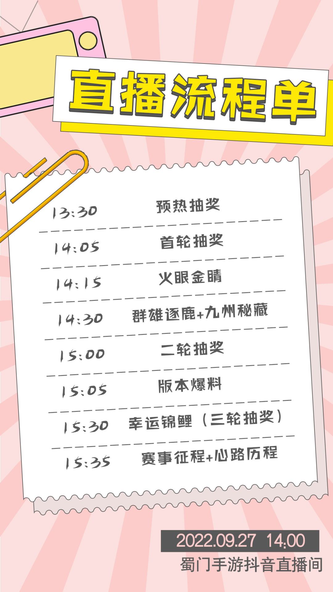 五周年庆典大幕拉开,嘉年华狂欢已经开启,各位蜀友可别忘了9月27日的直播约定,新版本爆料,趣味现场活动,多重抽奖好礼已经在等待,现在就给你们细细数来! 【13:30 预热抽奖】 在14点直播正式开始前半小时,直播间也会有福袋抽奖,每10分钟1轮,每轮发放1000抖币,奖品还有笔记本电脑一台。进入直播间,点击福袋即可参与抽奖。 【14:15 火眼金睛】 在首轮抽奖结束后,火眼金睛游戏环节开启。活动分