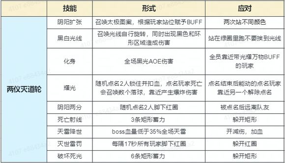 等级上限开放,镇魔渊更新了终极BOSS和隐藏彩蛋BOSS,各位都挑战了吗? 文字太长不看版↓↓↓↓ 两仪灭道轮 被动技能:【阴阳】 阴阳扩张:每隔一段时间,阴阳鱼在场景中召唤太极图案,图案消失时给站在相应区域的玩家赋予对应颜色的BUFF 抱阳(白):BUFF存在期间攻击上升、持续扣血,一直持续死亡时不删除 负阴(黑):BUFF存在期间移速上升,防御降低,一直持续死亡时不删除 阴阳相守:当在负阴、抱