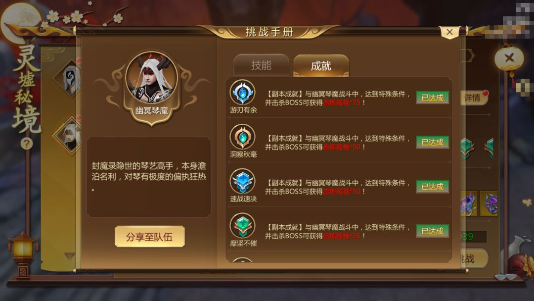 不知不觉间,灵墟秘境开启时间已经过半,大家都顺利通关了吗?之前就有很多蜀友来问门叔,“门叔啊,琴魔隐藏成就怎么获得啊?”今天门叔就仔细说说,琴魔隐藏成就。 【游刃有余】 类型:个人成就 要求:全程未被boss技能【御音波·宫】【御音波·商】命中的情况下通关 奖励:游刃有余仙章、赤炼残卷*75 建议:【御音波·宫】无论是一条还是三条音波,提示都很明显,看到后直接走开。 【御音波·商】释放前会有预警,