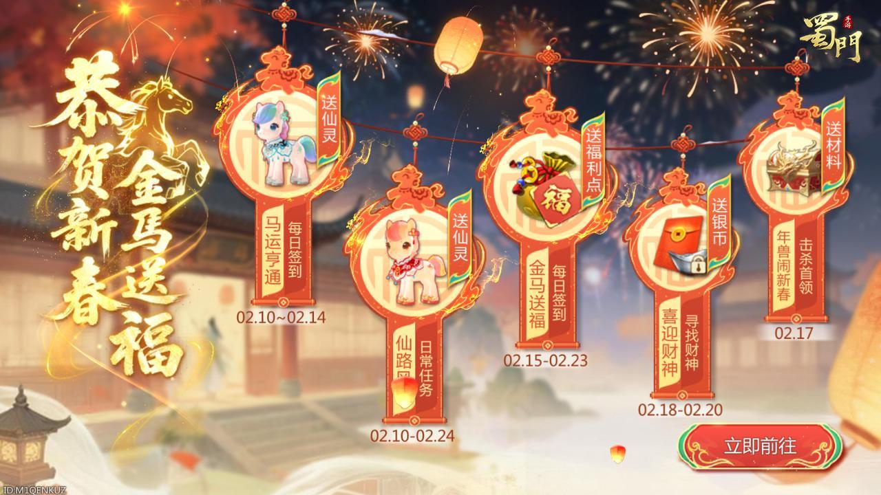 年关脚步将近,丙午马年马上就到蜀仙盟早已张灯结彩备好了大礼超丰富春节活动已全部就绪登录游戏就可获得全新马年暗金仙灵更有海量福利点、绑银等超值奖励等你拿!快随门叔一起往下看看活动详情吧~以下活动仅在服务器等级60级及以上的区服开启。活动时间:2026年2月10日-2026年2月14日活动内容:在活动期间,登录游戏全民都可以领取珍稀资源自选包*2,金灵仙灵草*1,扫荡券*20的春节福利!助力大家